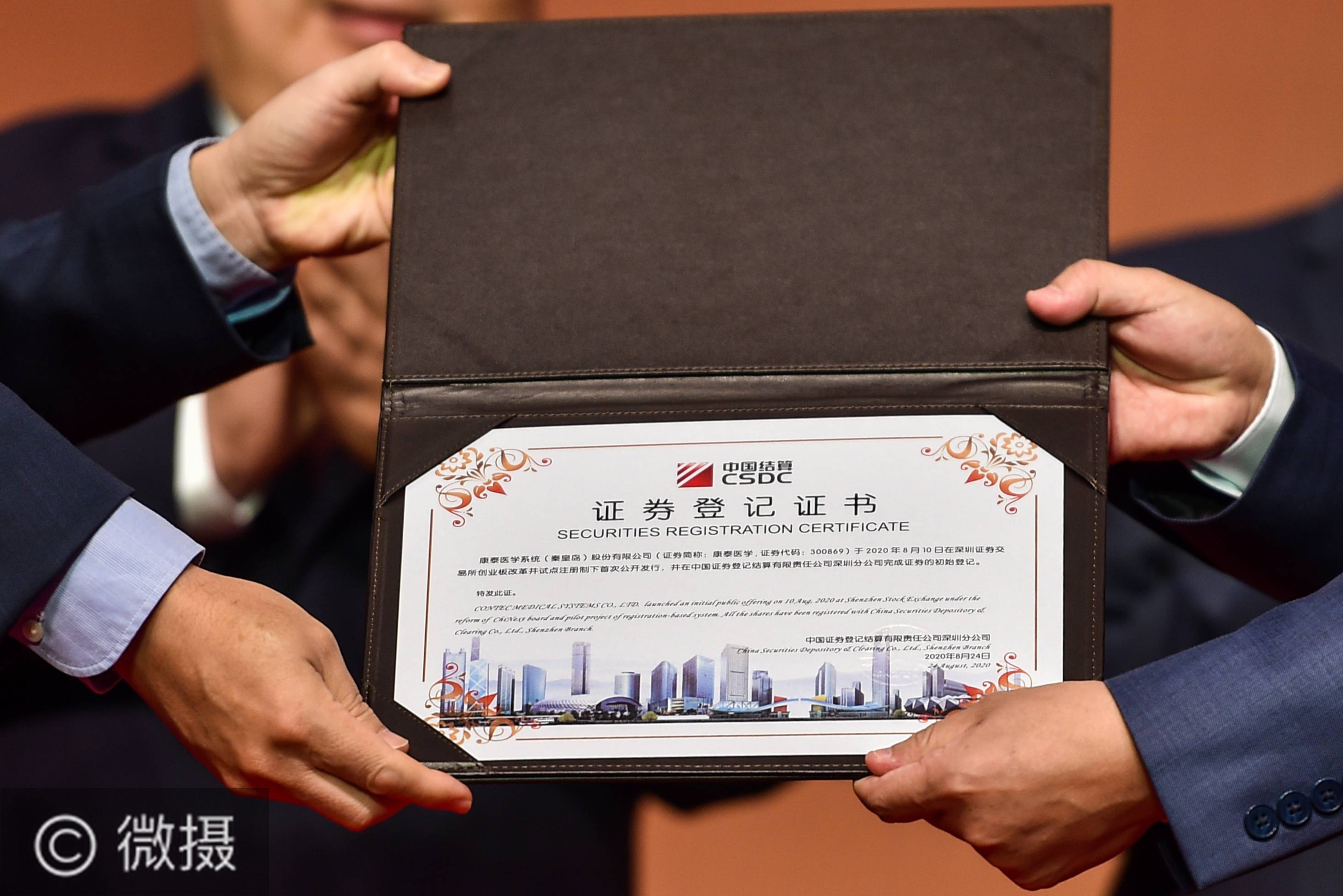 8月24日,在深圳证券交易所举行的创业板改革并试点注册制首批企业上市仪式上,上市企业收取证券登记证书。在万众瞩目中,承载着众多中小创新企业希望的创业板注册制,在今天“扬帆起航”——首批18家企业鸣锣上市,资本市场注册制改革持续迈进!新华社记者 毛思倩 摄