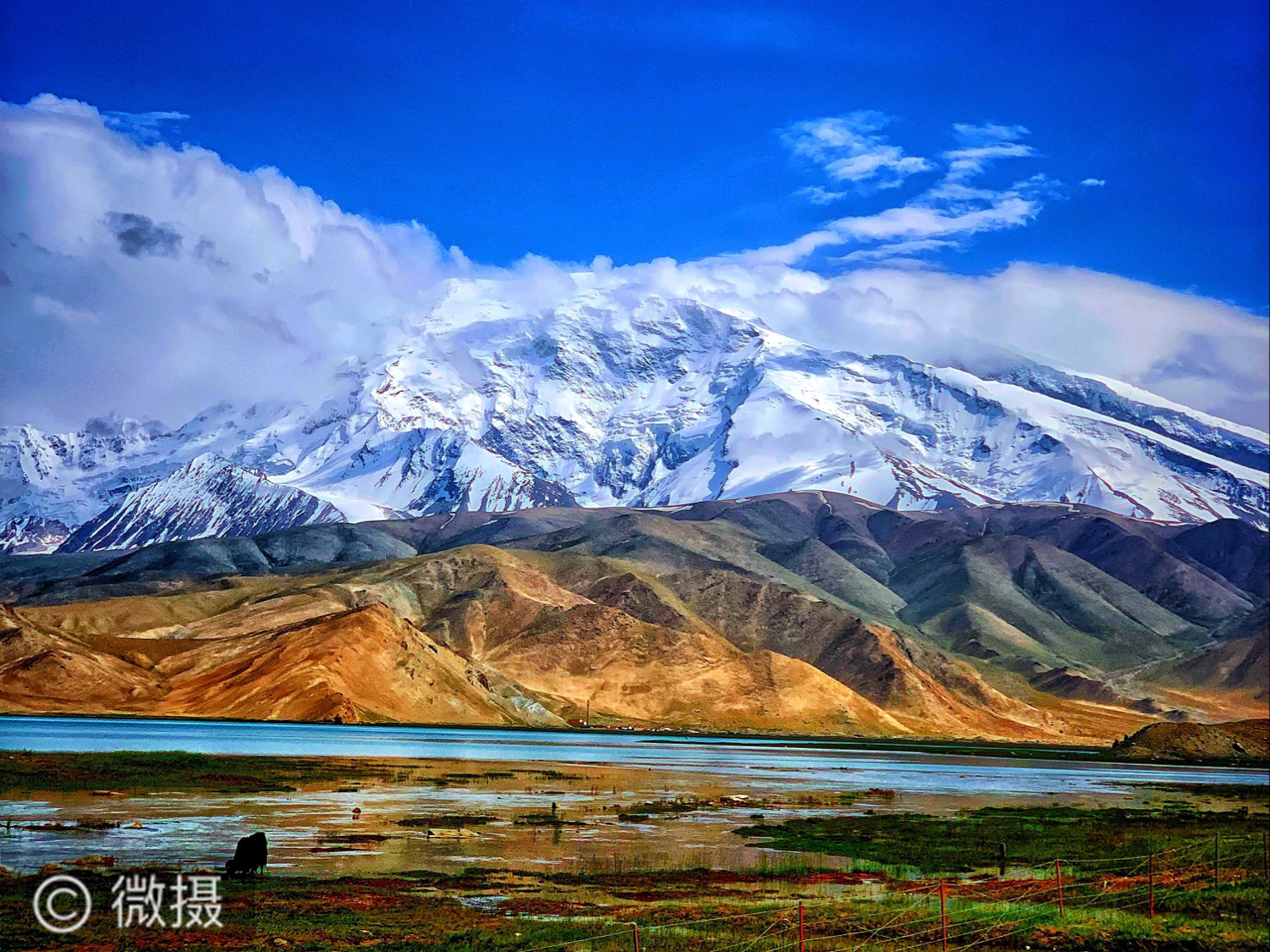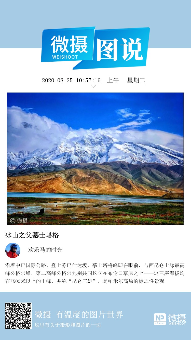 沿着中巴国际公路,登上苏巴什达坂,慕士塔格峰即在眼前,与西昆仑山脉最高峰公格尔峰、第二高峰公格尔九别共同屹立在布伦口草原之上——这三座海拔均在7500米以上的山峰,并称“昆仑三雄”。是帕米尔高原的标志性景观。