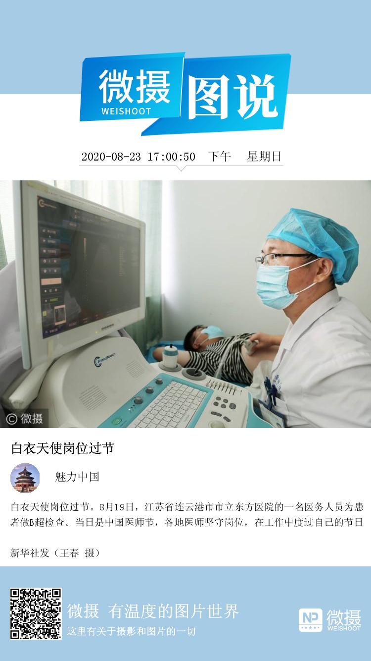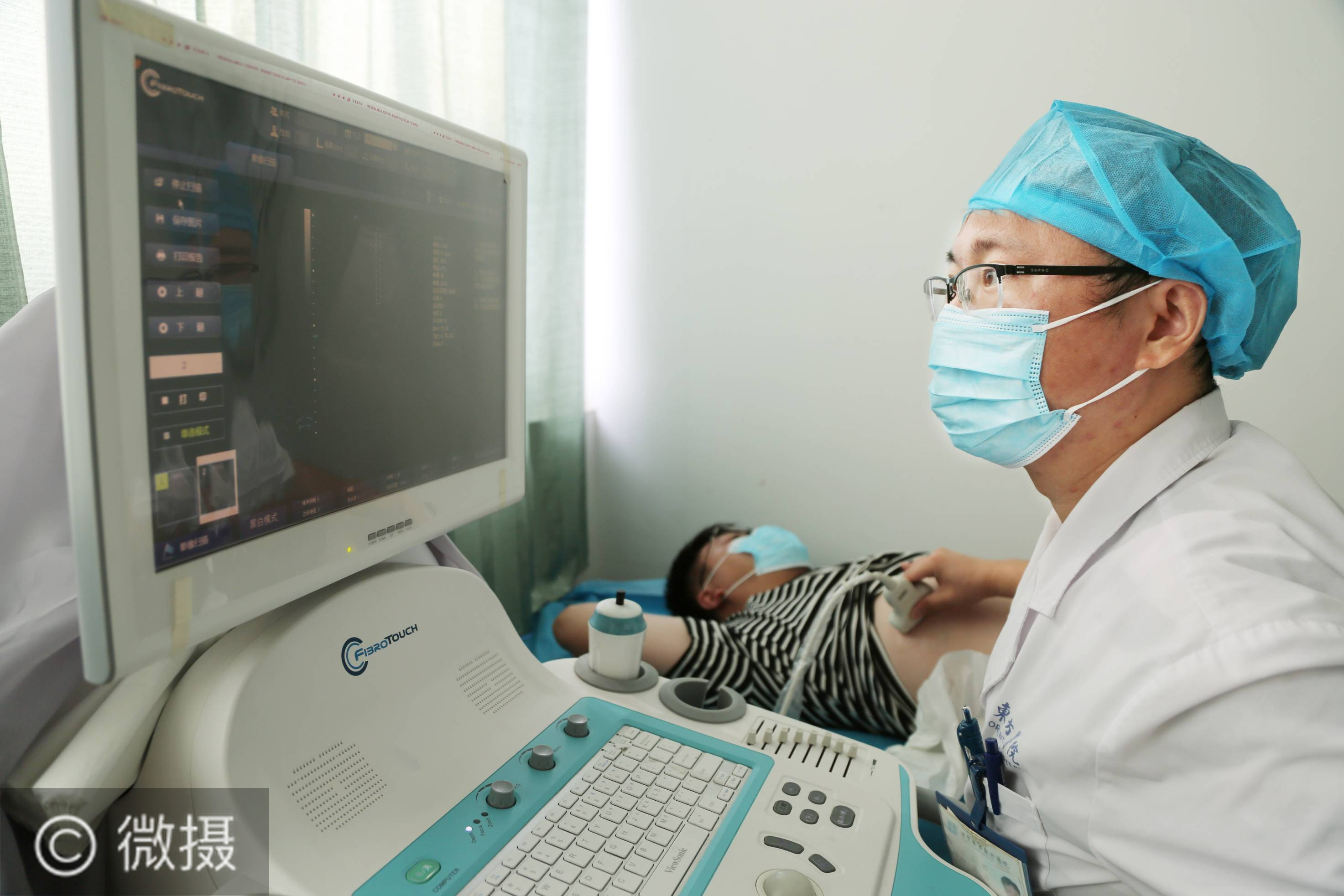 白衣天使岗位过节。8月19日,江苏省连云港市市立东方医院的一名医务人员为患者做B超检查。当日是中国医师节,各地医师坚守岗位,在工作中度过自己的节日。 新华社发(王春 摄)