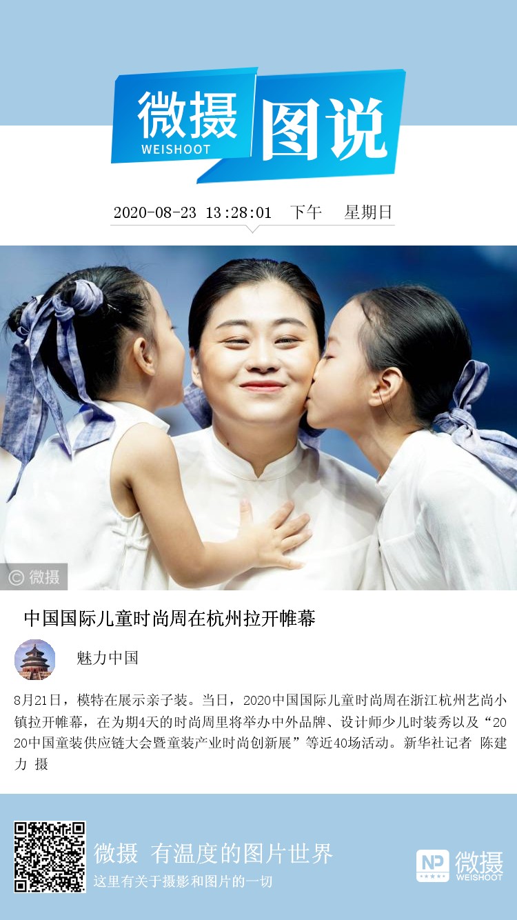 8月21日,模特在展示亲子装。当日,2020中国国际儿童时尚周在浙江杭州艺尚小镇拉开帷幕,在为期4天的时尚周里将举办中外品牌、设计师少儿时装秀以及“2020中国童装供应链大会暨童装产业时尚创新展”等近40场活动。新华社记者 陈建力 摄