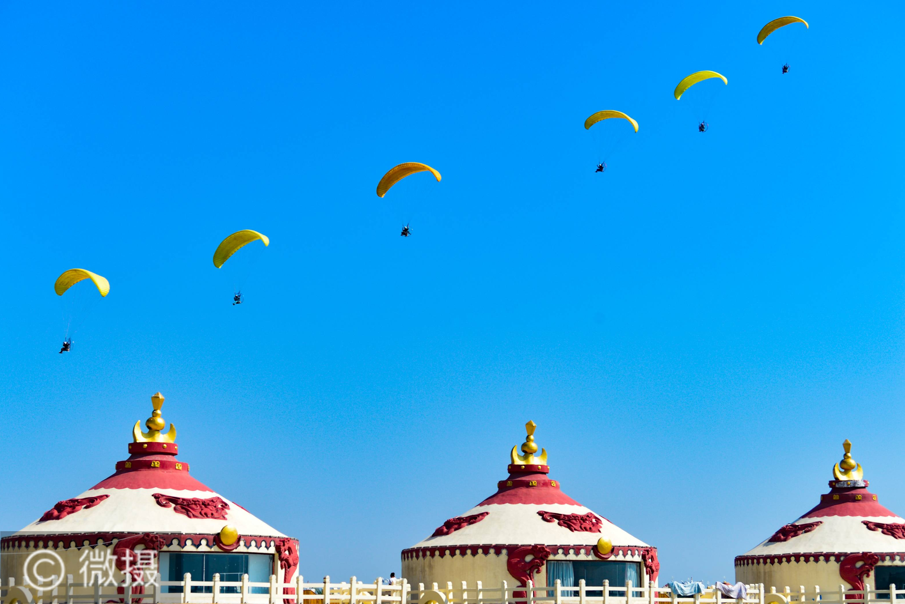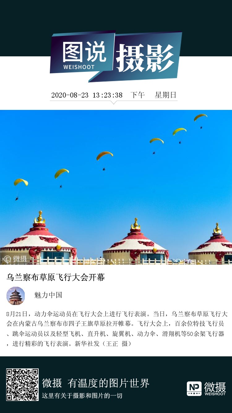8月21日,动力伞运动员在飞行大会上进行飞行表演。当日,乌兰察布草原飞行大会在内蒙古乌兰察布市四子王旗草原拉开帷幕。飞行大会上,百余位特技飞行员、跳伞运动员以及轻型飞机、直升机、旋翼机、动力伞、滑翔机等50余架飞行器,进行精彩的飞行表演。新华社发(王正 摄)