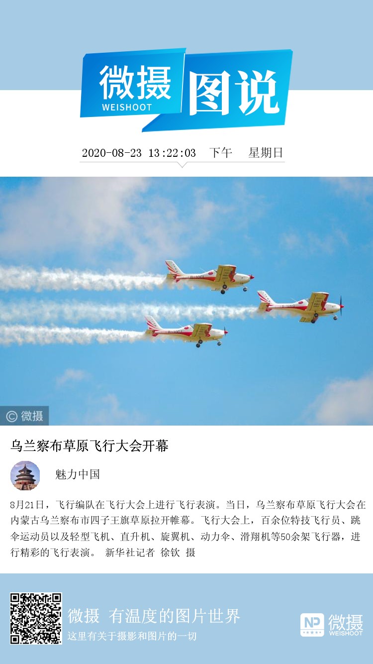 8月21日,飞行编队在飞行大会上进行飞行表演。当日,乌兰察布草原飞行大会在内蒙古乌兰察布市四子王旗草原拉开帷幕。飞行大会上,百余位特技飞行员、跳伞运动员以及轻型飞机、直升机、旋翼机、动力伞、滑翔机等50余架飞行器,进行精彩的飞行表演。 新华社记者 徐钦 摄
