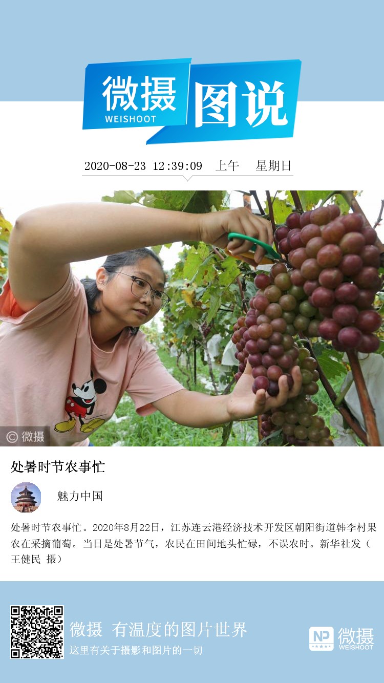 处暑时节农事忙。2020年8月22日,江苏连云港经济技术开发区朝阳街道韩李村果农在采摘葡萄。当日是处暑节气,农民在田间地头忙碌,不误农时。新华社发(王健民 摄)