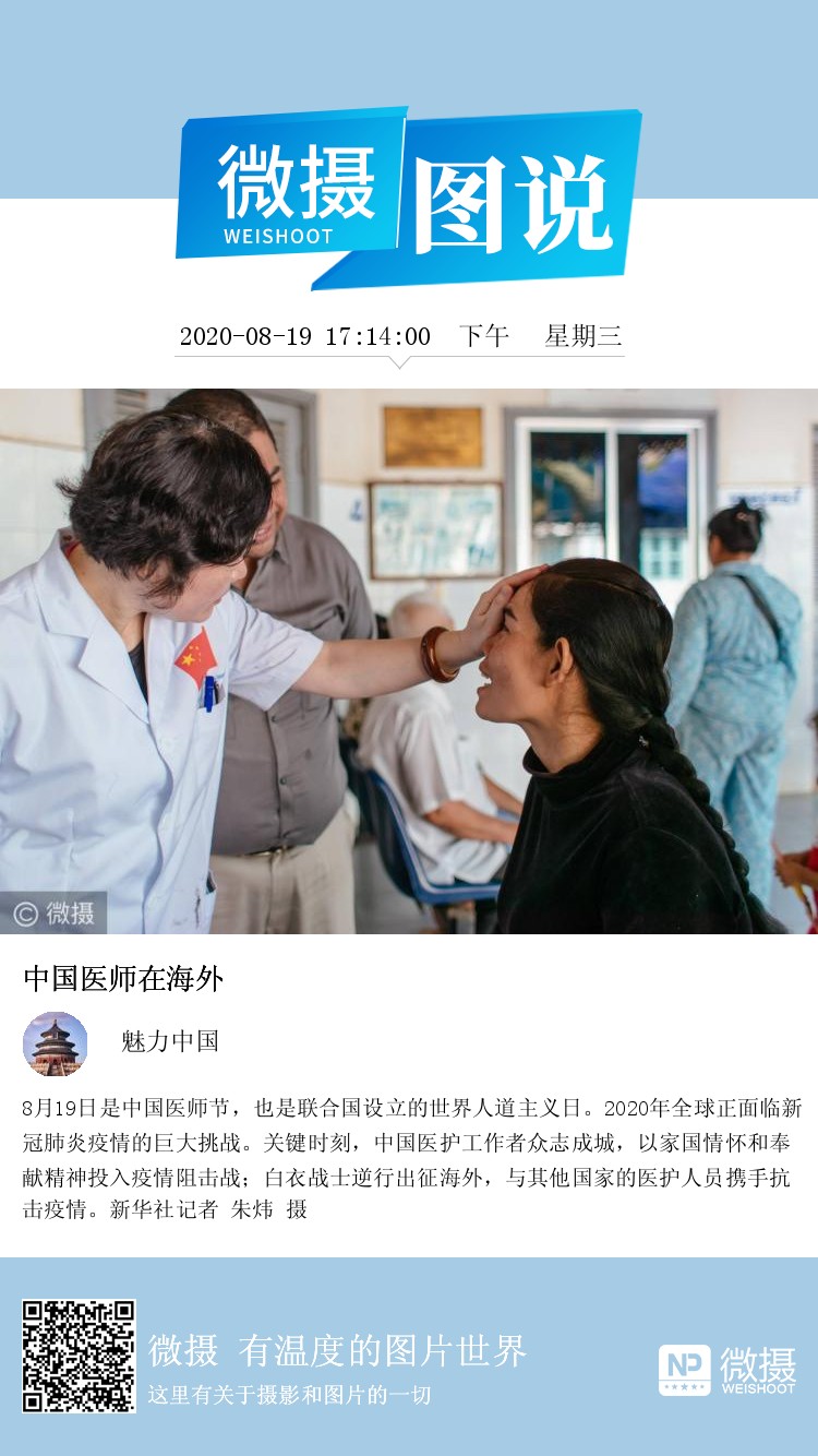 8月19日是中国医师节,也是联合国设立的世界人道主义日。2020年全球正面临新冠肺炎疫情的巨大挑战。关键时刻,中国医护工作者众志成城,以家国情怀和奉献精神投入疫情阻击战;白衣战士逆行出征海外,与其他国家的医护人员携手抗击疫情。新华社记者 朱炜 摄