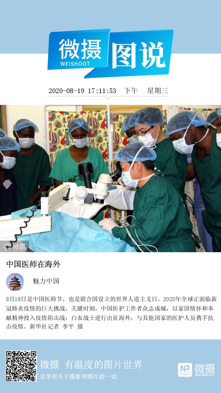 8月19日是中国医师节,也是联合国设立的世界人道主义日。2020年全球正面临新冠肺炎疫情的巨大挑战。关键时刻,中国医护工作者众志成城,以家国情怀和奉献精神投入疫情阻击战;白衣战士逆行出征海外,与其他国家的医护人员携手抗击疫情。新华社记者 李平 摄