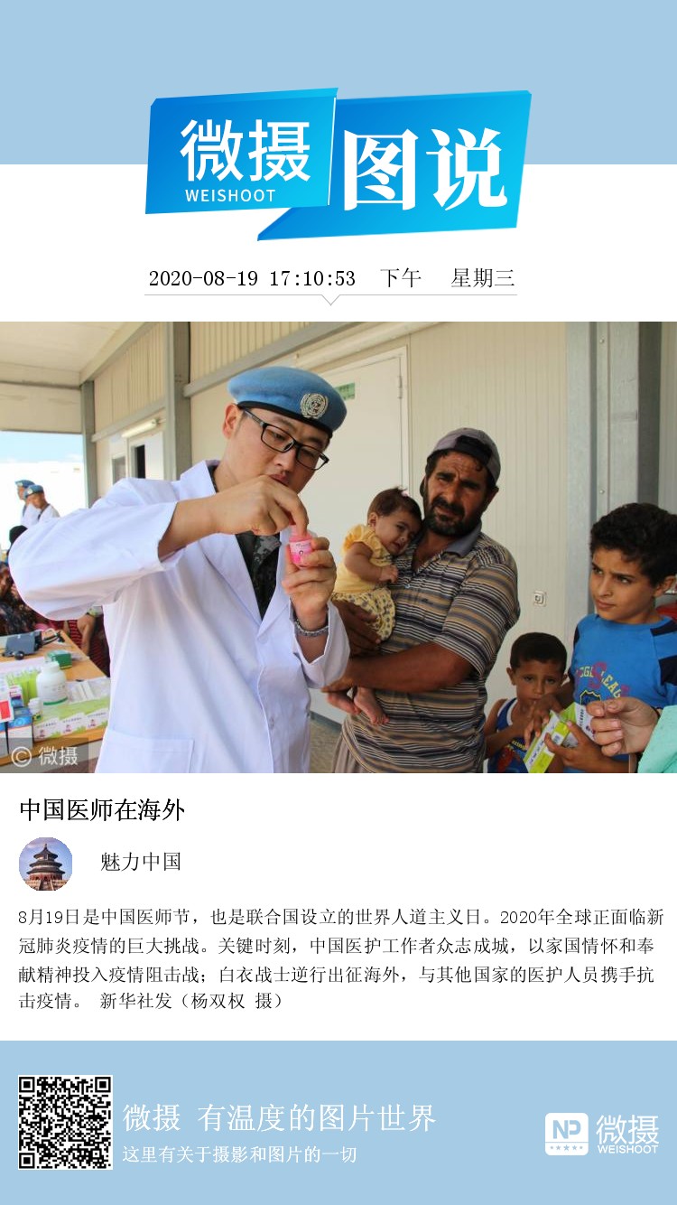 8月19日是中国医师节,也是联合国设立的世界人道主义日。2020年全球正面临新冠肺炎疫情的巨大挑战。关键时刻,中国医护工作者众志成城,以家国情怀和奉献精神投入疫情阻击战;白衣战士逆行出征海外,与其他国家的医护人员携手抗击疫情。 新华社发(杨双权 摄)