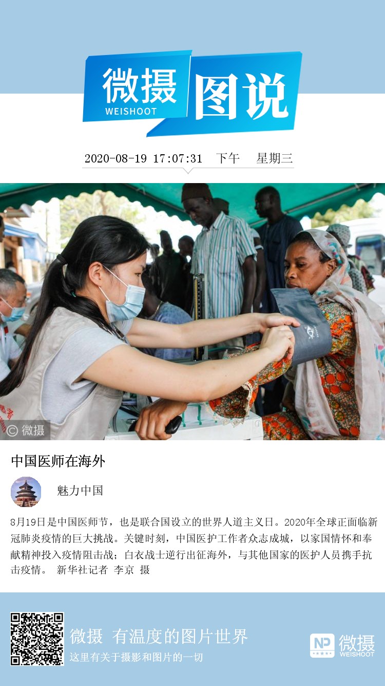 8月19日是中国医师节,也是联合国设立的世界人道主义日。2020年全球正面临新冠肺炎疫情的巨大挑战。关键时刻,中国医护工作者众志成城,以家国情怀和奉献精神投入疫情阻击战;白衣战士逆行出征海外,与其他国家的医护人员携手抗击疫情。 新华社记者 李京 摄