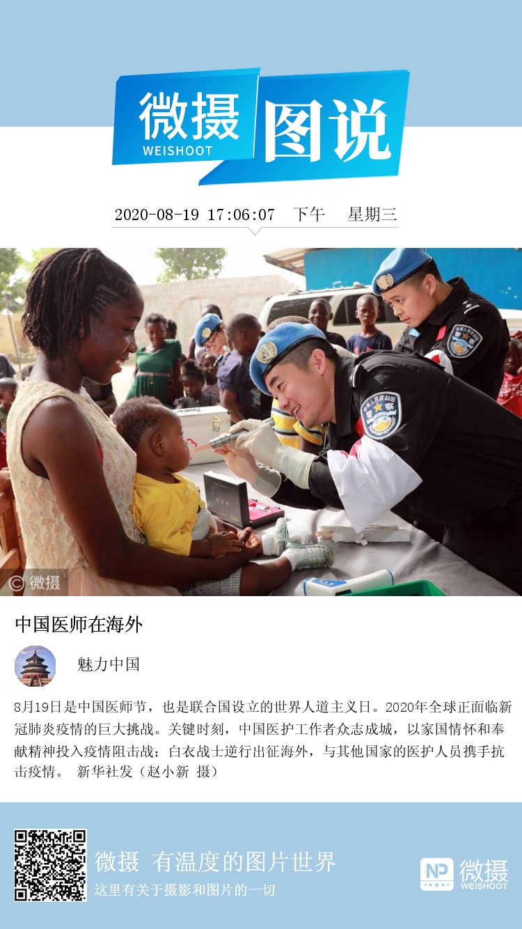 8月19日是中国医师节,也是联合国设立的世界人道主义日。2020年全球正面临新冠肺炎疫情的巨大挑战。关键时刻,中国医护工作者众志成城,以家国情怀和奉献精神投入疫情阻击战;白衣战士逆行出征海外,与其他国家的医护人员携手抗击疫情。 新华社发(赵小新 摄)