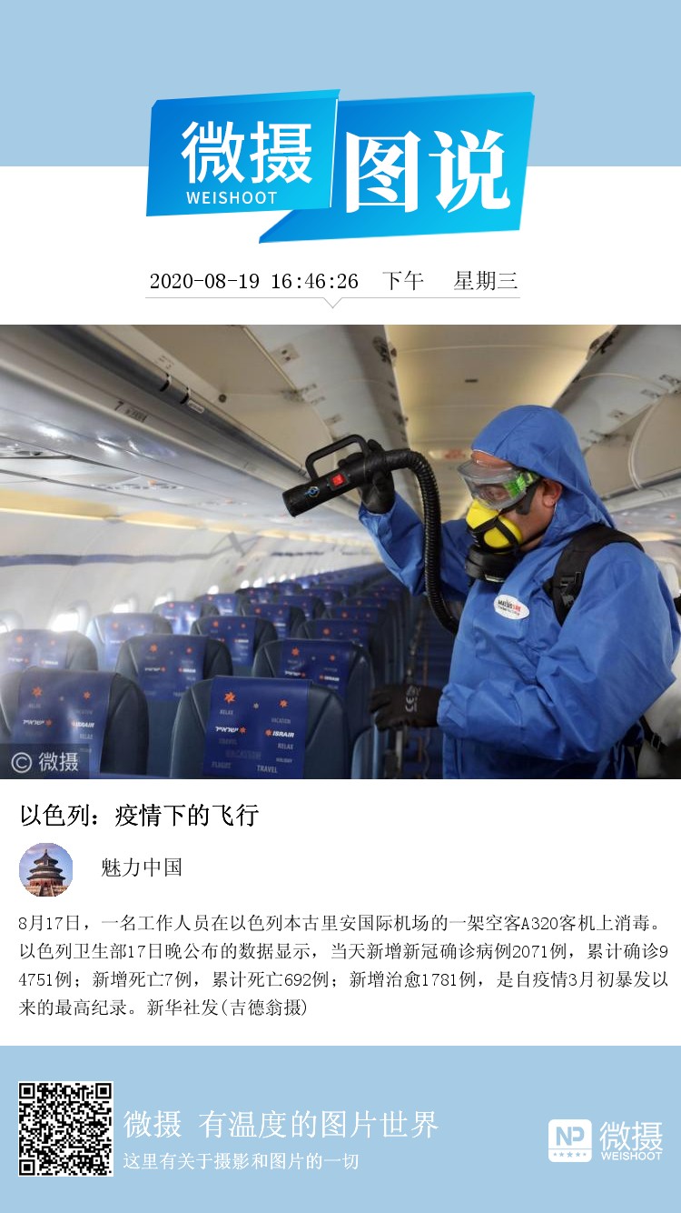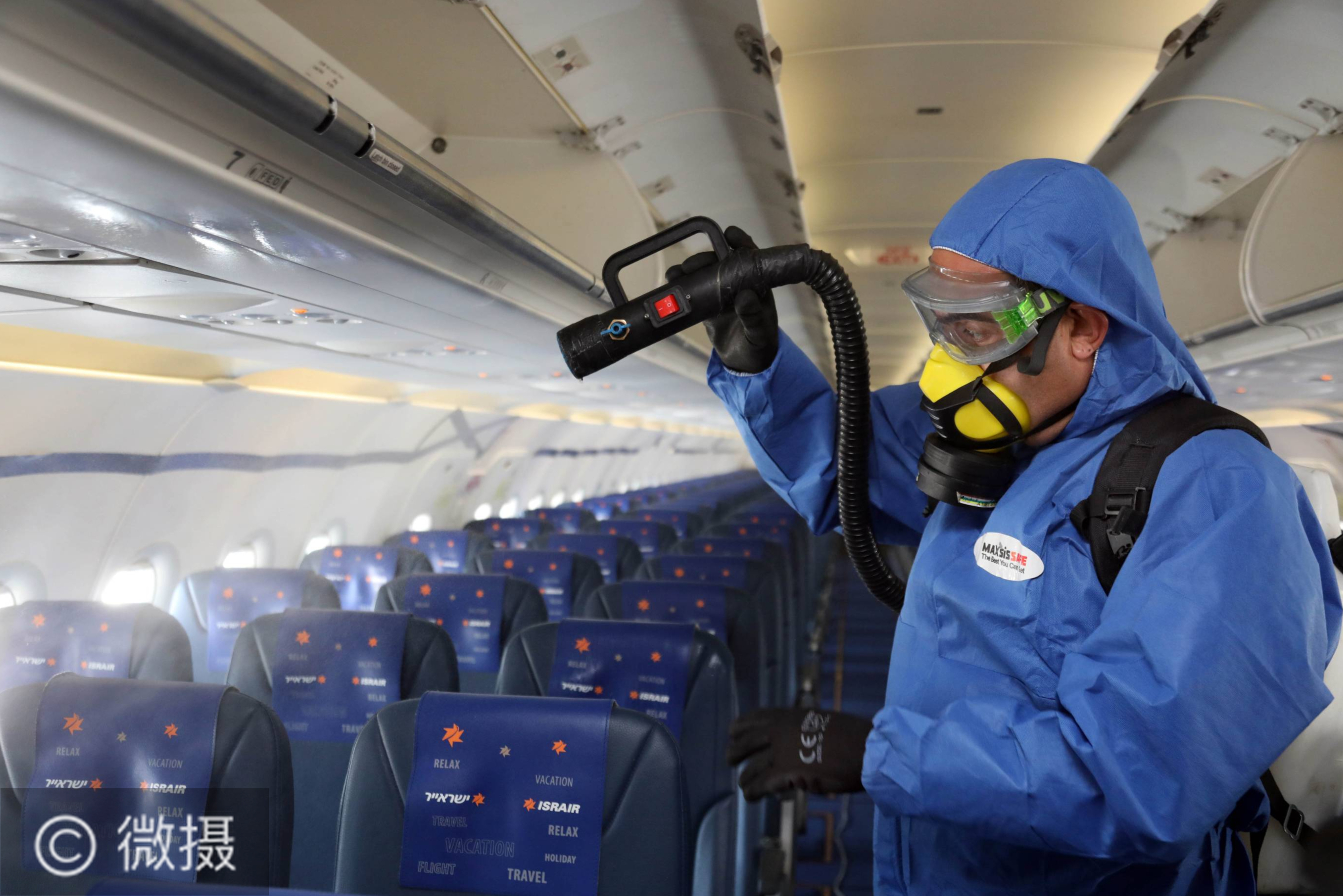 8月17日,一名工作人员在以色列本古里安国际机场的一架空客A320客机上消毒。以色列卫生部17日晚公布的数据显示,当天新增新冠确诊病例2071例,累计确诊94751例;新增死亡7例,累计死亡692例;新增治愈1781例,是自疫情3月初暴发以来的最高纪录。新华社发(吉德翁摄)