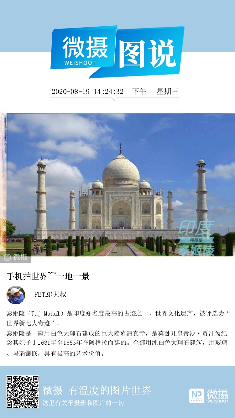 泰姬陵(Taj Mahal)是印度知名度最高的古迹之一,世界文化遗产,被评选为“世界新七大奇迹”。 泰姬陵是一座用白色大理石建成的巨大陵墓清真寺,是莫卧儿皇帝沙·贾汗为纪念其妃子于1631年至1653年在阿格拉而建的。全部用纯白色大理石建筑,用玻璃、玛瑙镶嵌,具有极高的艺术价值。
