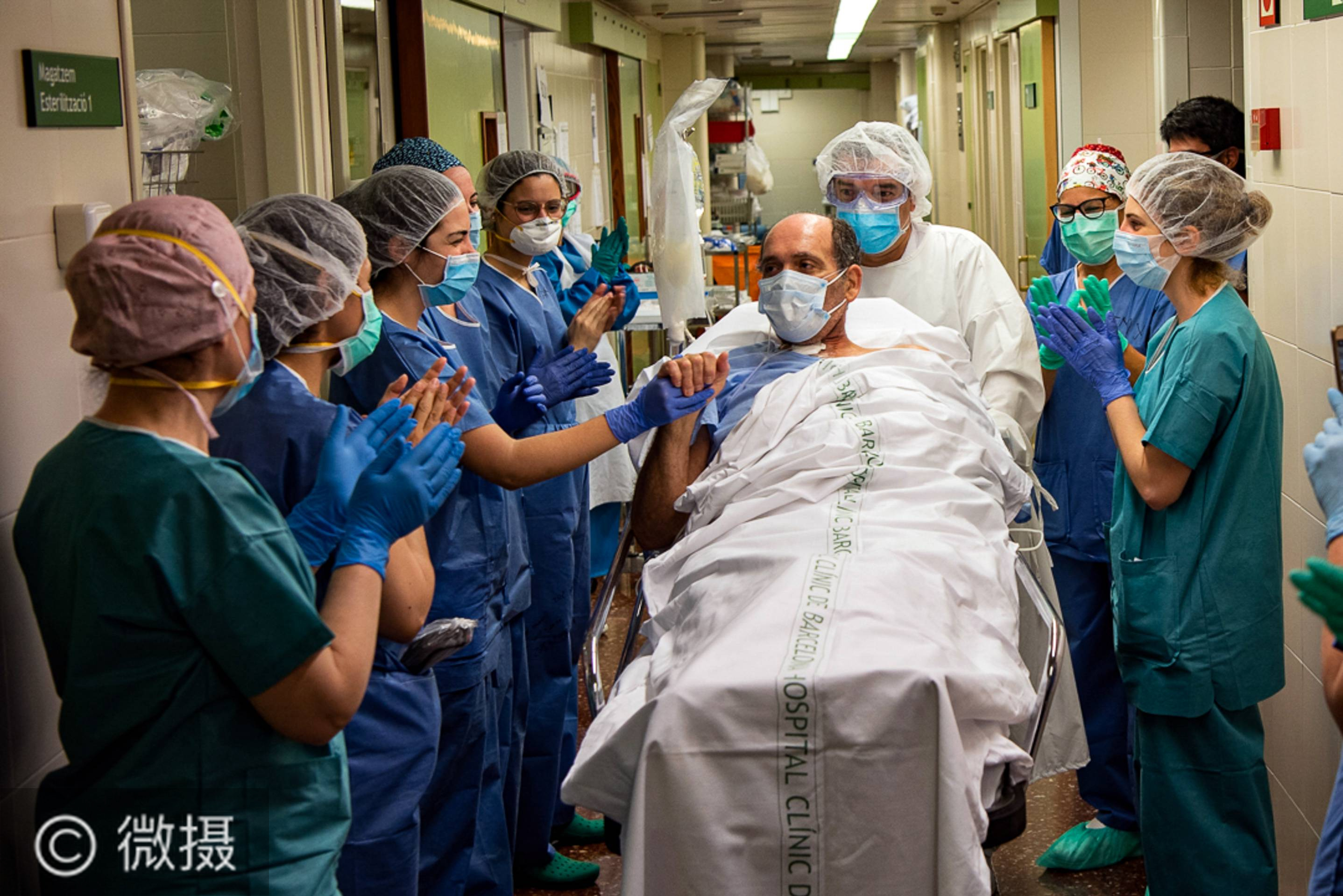 世界抗疫之战的启示——写在2020年全球新冠确诊病例达2020万之际。5月7日,在西班牙巴塞罗那的一家医院,一名新冠患者在离开重症监护室前和医护人员握手致意。新华社发(弗朗西斯科·阿维亚摄)