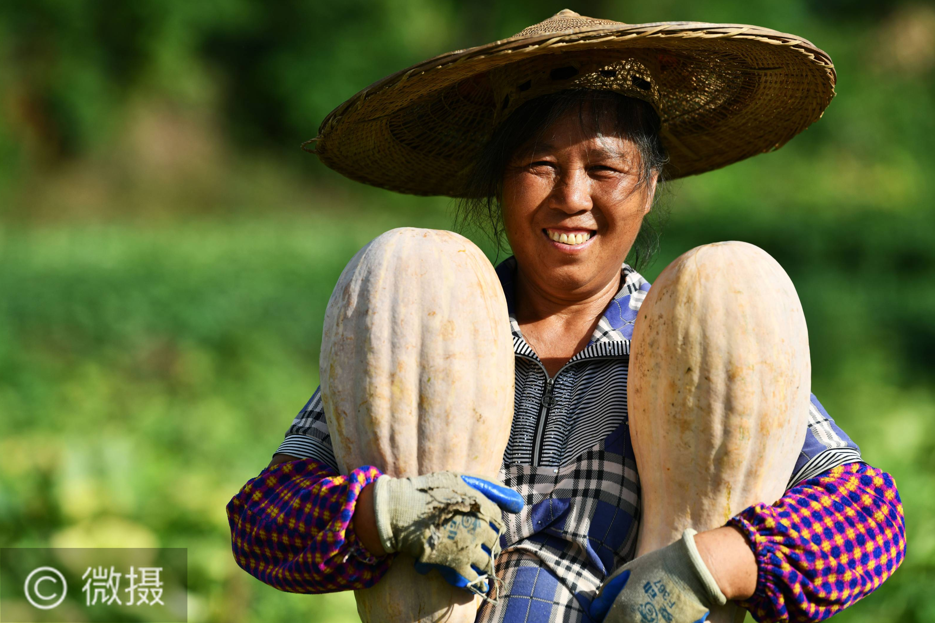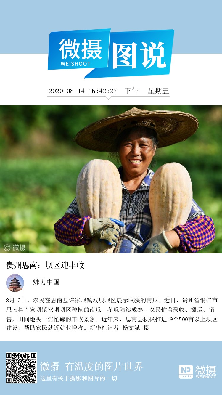8月12日,农民在思南县许家坝镇双坝坝区展示收获的南瓜。近日,贵州省铜仁市思南县许家坝镇双坝坝区种植的南瓜、冬瓜陆续成熟,农民忙着采收、搬运、销售,田间地头一派忙碌的丰收景象。近年来,思南县积极推进19个500亩以上坝区建设,帮助农民就近就业增收。新华社记者 杨文斌 摄