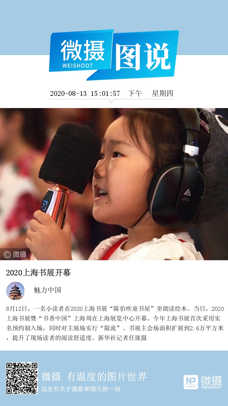 8月12日,一名小读者在2020上海书展“陈伯吹童书屋”里朗读绘本。当日,2020上海书展暨“书香中国”上海周在上海展览中心开幕。今年上海书展首次采用实名预约制入场,同时对主展场实行“限流”。书展主会场面积扩展到2.6万平方米,提升了现场读者的阅读舒适度。新华社记者任珑摄