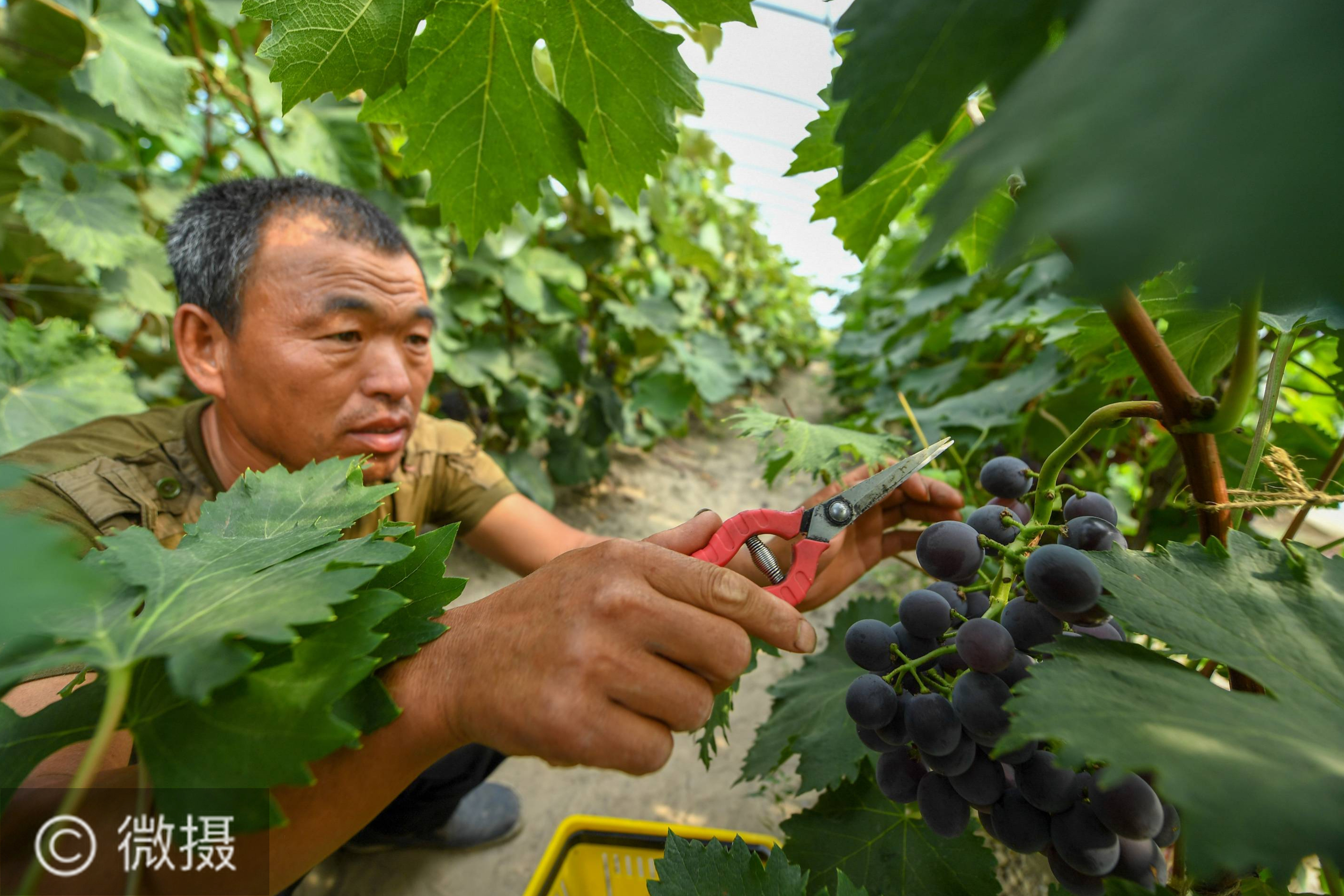 8月12日,在镇赉县镇赉镇南岗村,农民王永刚采摘葡萄。脱贫攻坚战打响以来,镇赉县将产业扶贫作为精准脱贫的治本之策,积极围绕当地资源开发脱贫项目。当地在不适宜种植传统作物的地块,推广经济作物种植;依托河湖连通工程,实施庭院经济促进农民增收。新华社记者 张楠 摄