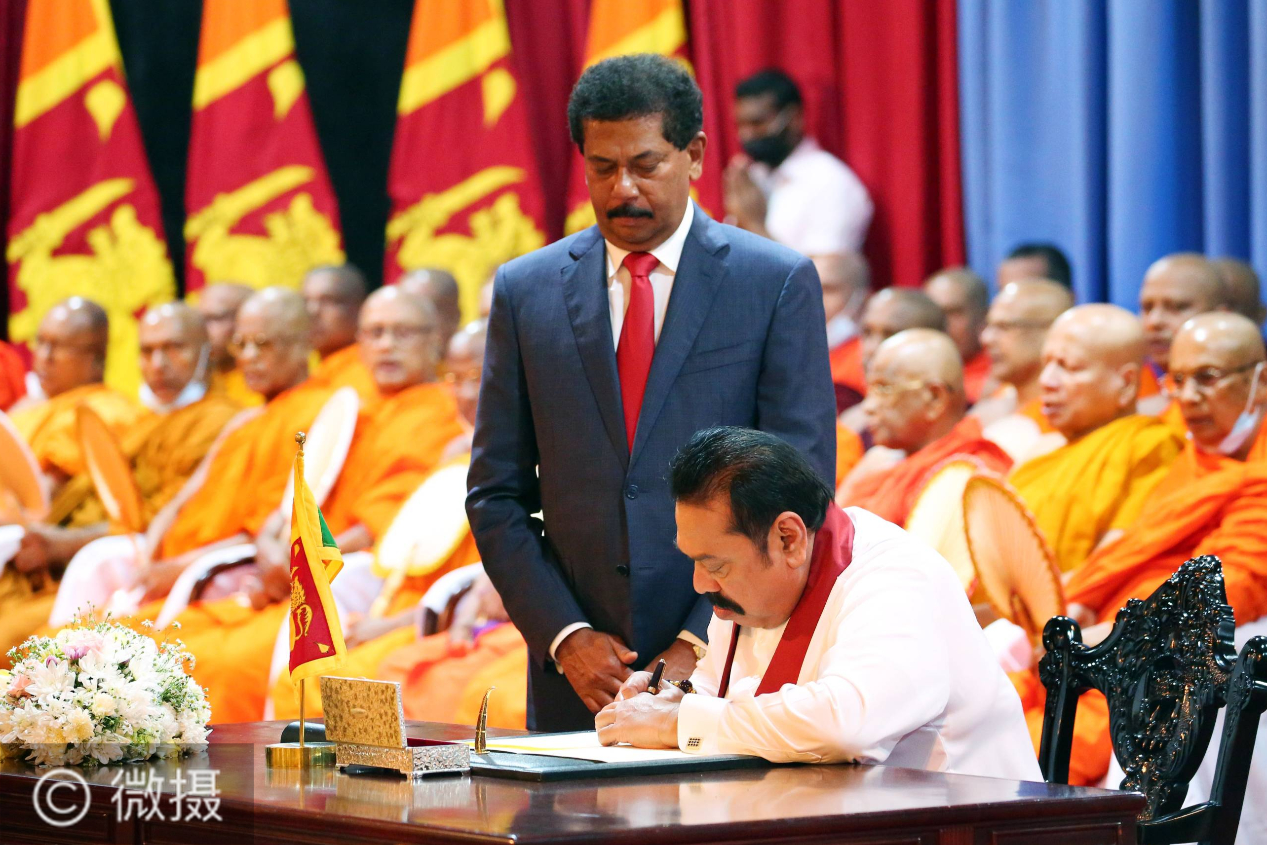 8月11日,斯里兰卡新政府总理马欣达·拉贾帕克萨在科伦坡总理府签署文件正式履职。斯里兰卡新政府总理马欣达·拉贾帕克萨11日在科伦坡总理府正式开始履职。在选举中,马欣达率领人民阵线党以压倒性优势获胜,随即被斯总统戈塔巴雅·拉贾帕克萨任命为新政府总理。新华社发(阿吉特·佩雷拉 摄)