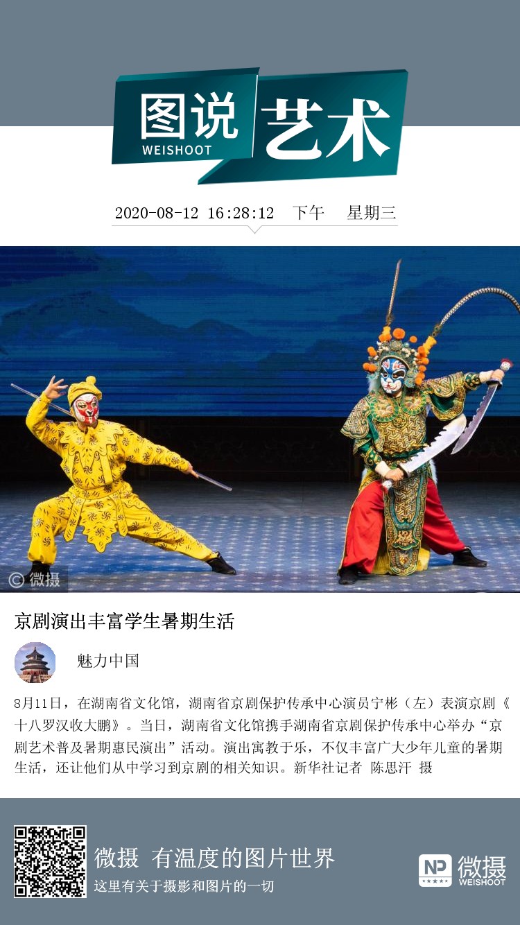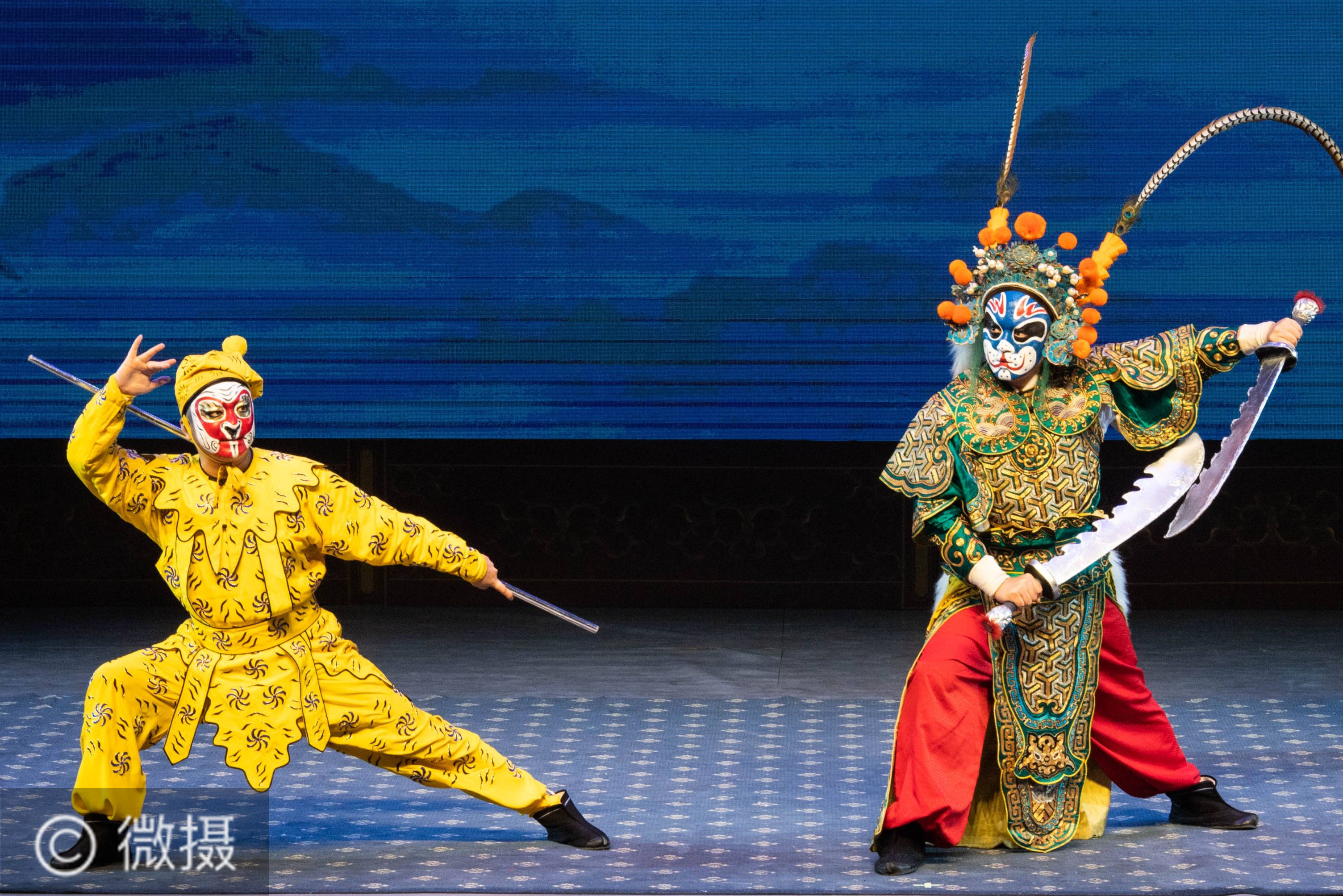 8月11日,在湖南省文化馆,湖南省京剧保护传承中心演员宁彬(左)表演京剧《十八罗汉收大鹏》。当日,湖南省文化馆携手湖南省京剧保护传承中心举办“京剧艺术普及暑期惠民演出”活动。演出寓教于乐,不仅丰富广大少年儿童的暑期生活,还让他们从中学习到京剧的相关知识。新华社记者 陈思汗 摄