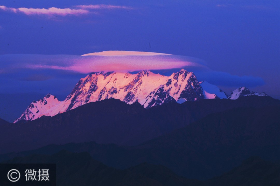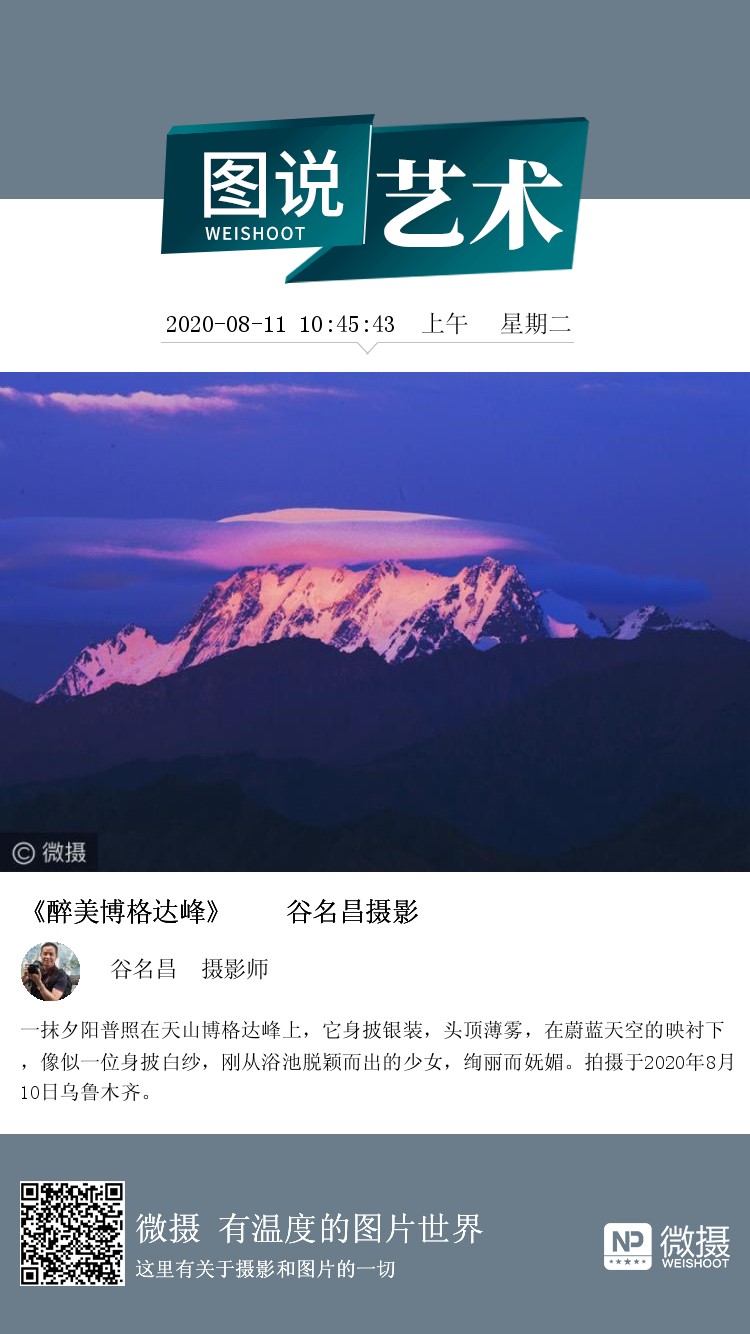 一抹夕阳普照在天山博格达峰上,它身披银装,头顶薄雾,在蔚蓝天空的映衬下,像似一位身披白纱,刚从浴池脱颖而出的少女,绚丽而妩媚。拍摄于2020年8月10日乌鲁木齐。