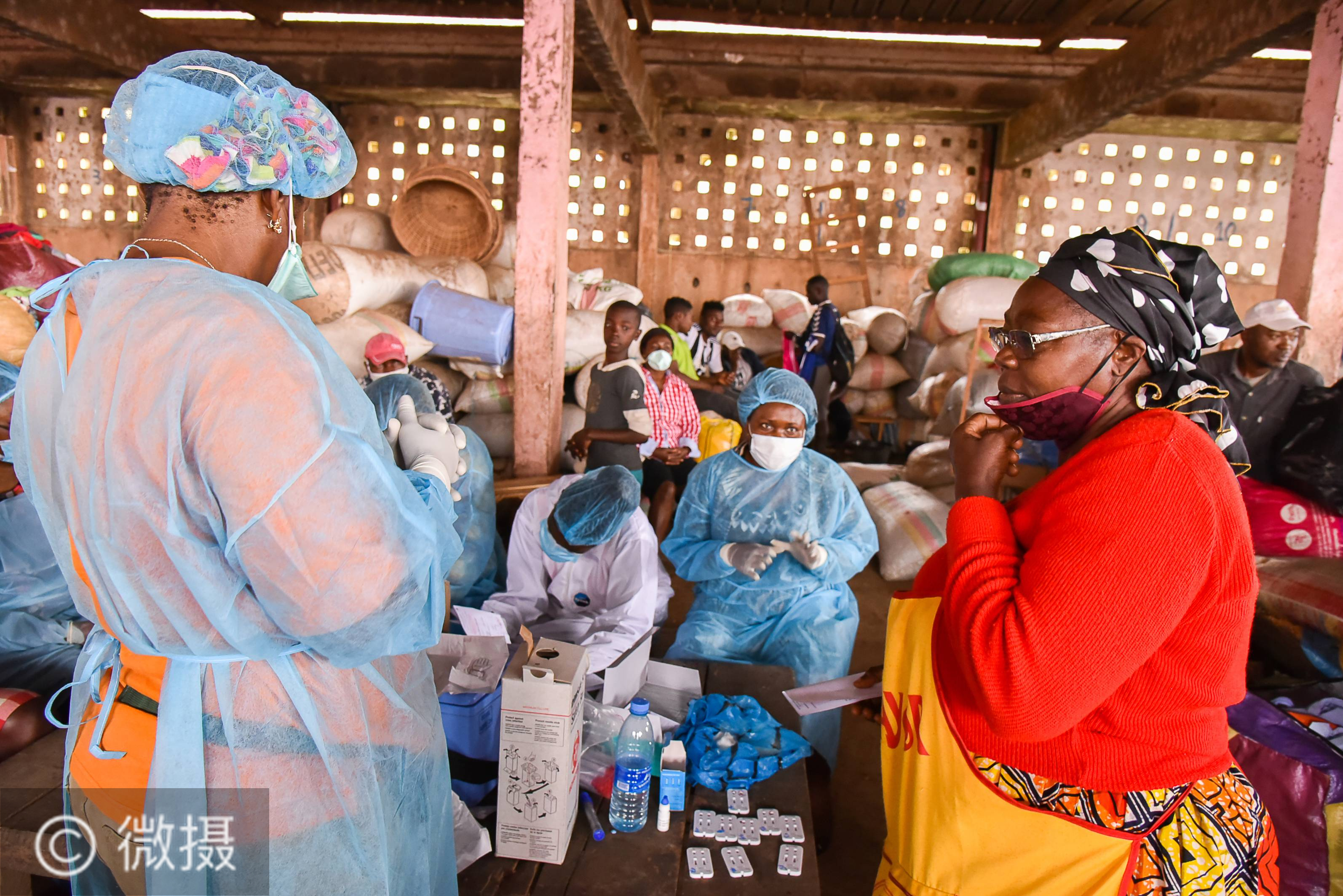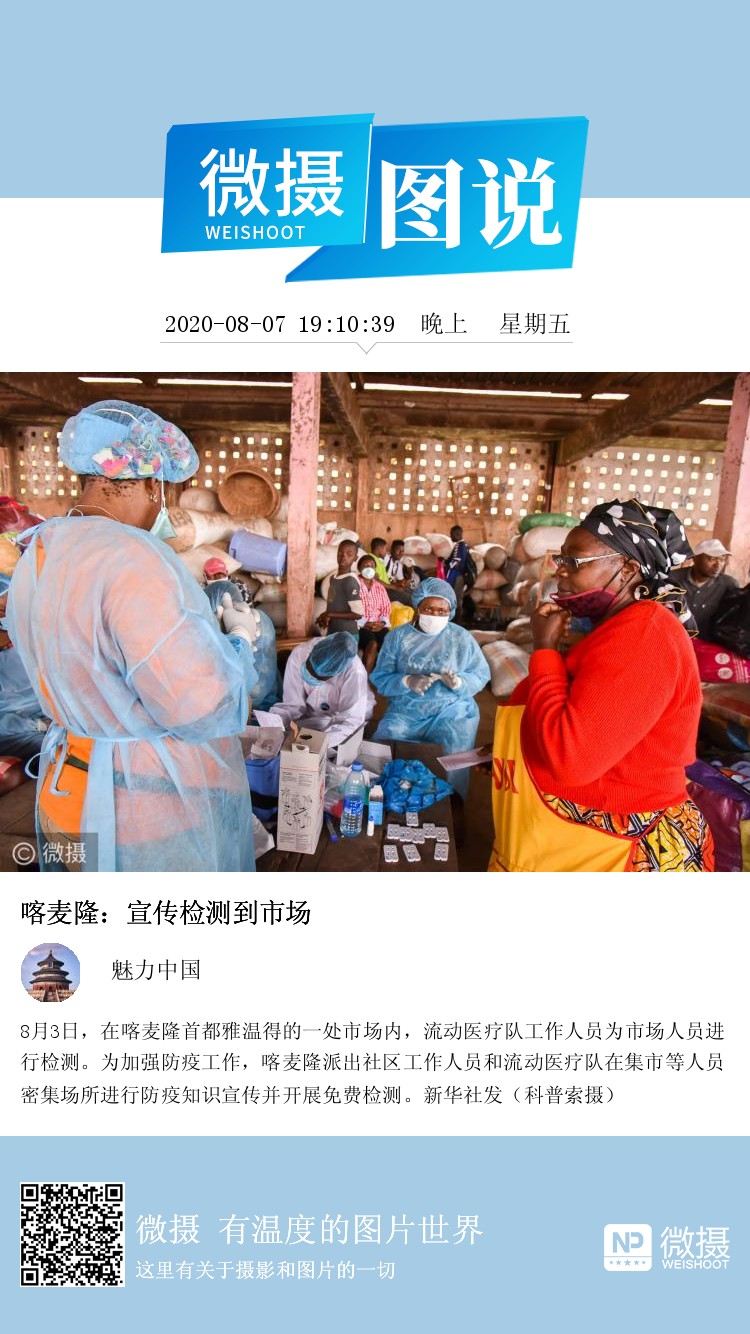 8月3日,在喀麦隆首都雅温得的一处市场内,流动医疗队工作人员为市场人员进行检测。为加强防疫工作,喀麦隆派出社区工作人员和流动医疗队在集市等人员密集场所进行防疫知识宣传并开展免费检测。新华社发(科普索摄)