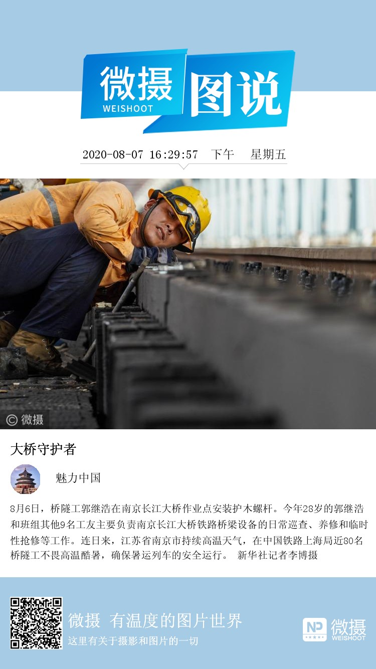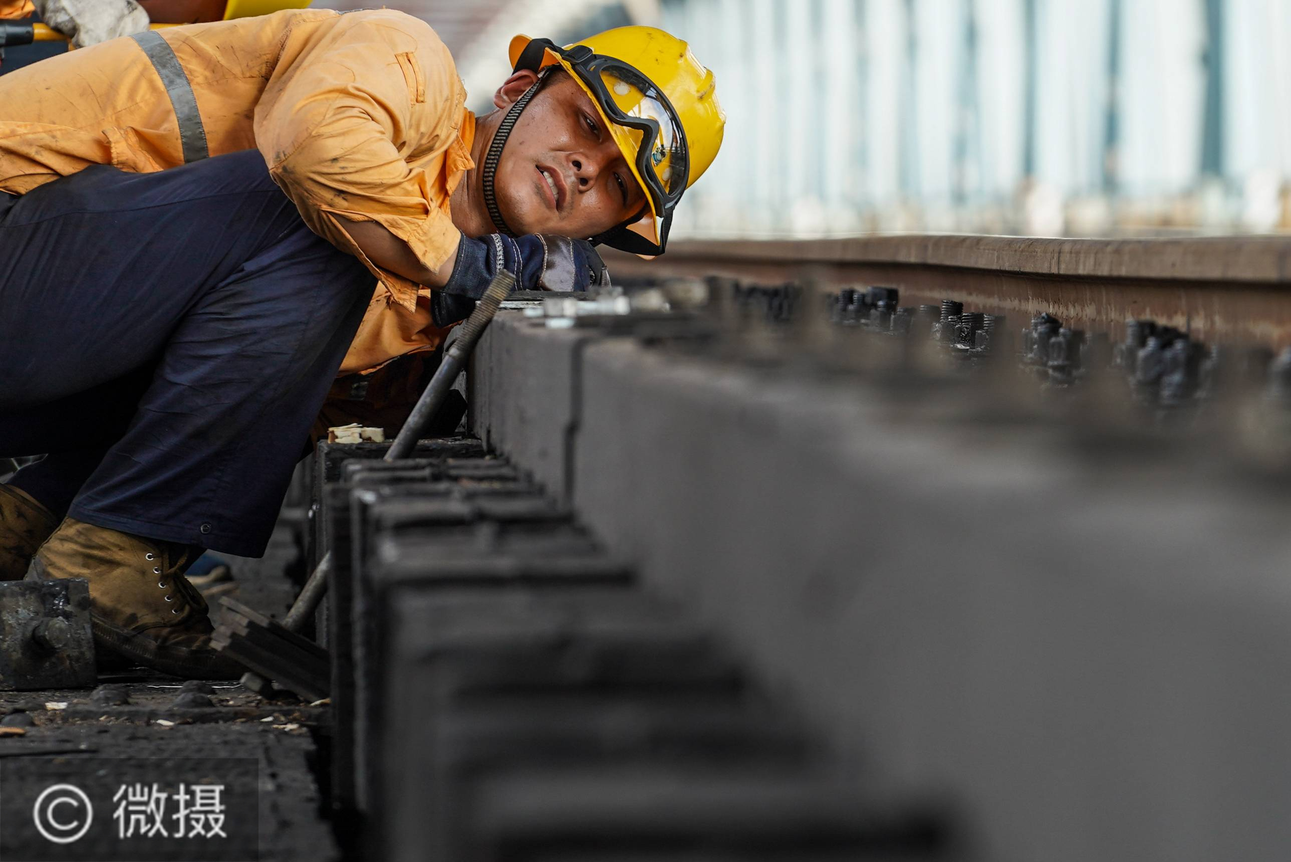 8月6日,桥隧工郭继浩在南京长江大桥作业点安装护木螺杆。今年28岁的郭继浩和班组其他9名工友主要负责南京长江大桥铁路桥梁设备的日常巡查、养修和临时性抢修等工作。连日来,江苏省南京市持续高温天气,在中国铁路上海局近80名桥隧工不畏高温酷暑,确保暑运列车的安全运行。 新华社记者李博摄