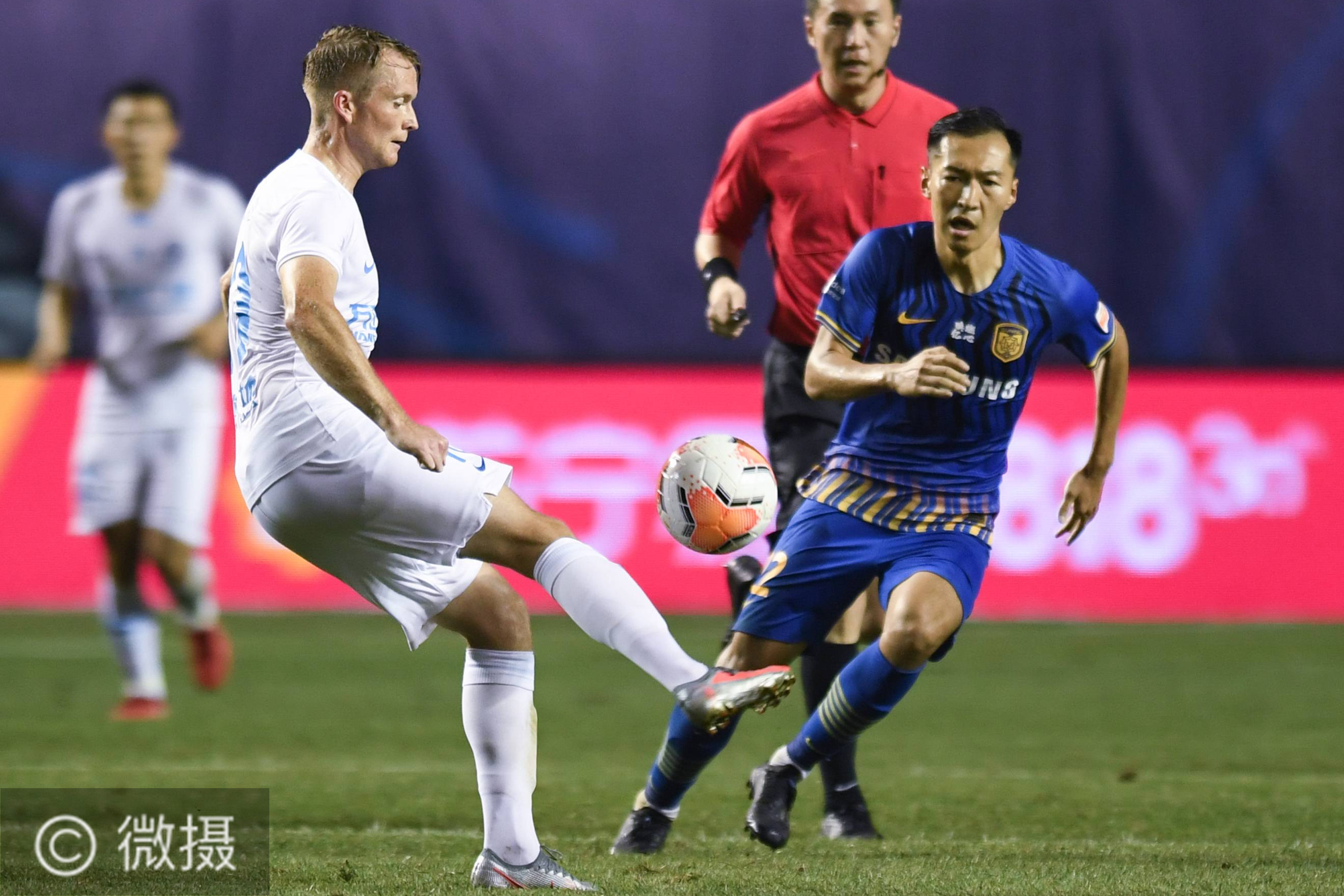 8月4日,大连人队球员萨姆·拉尔森(左)在比赛中传球。当日,在2020赛季中国足球协会超级联赛第一阶段(大连赛区)第三轮比赛中,江苏苏宁易购队以2比1战胜大连人队。新华社记者 龙雷 摄