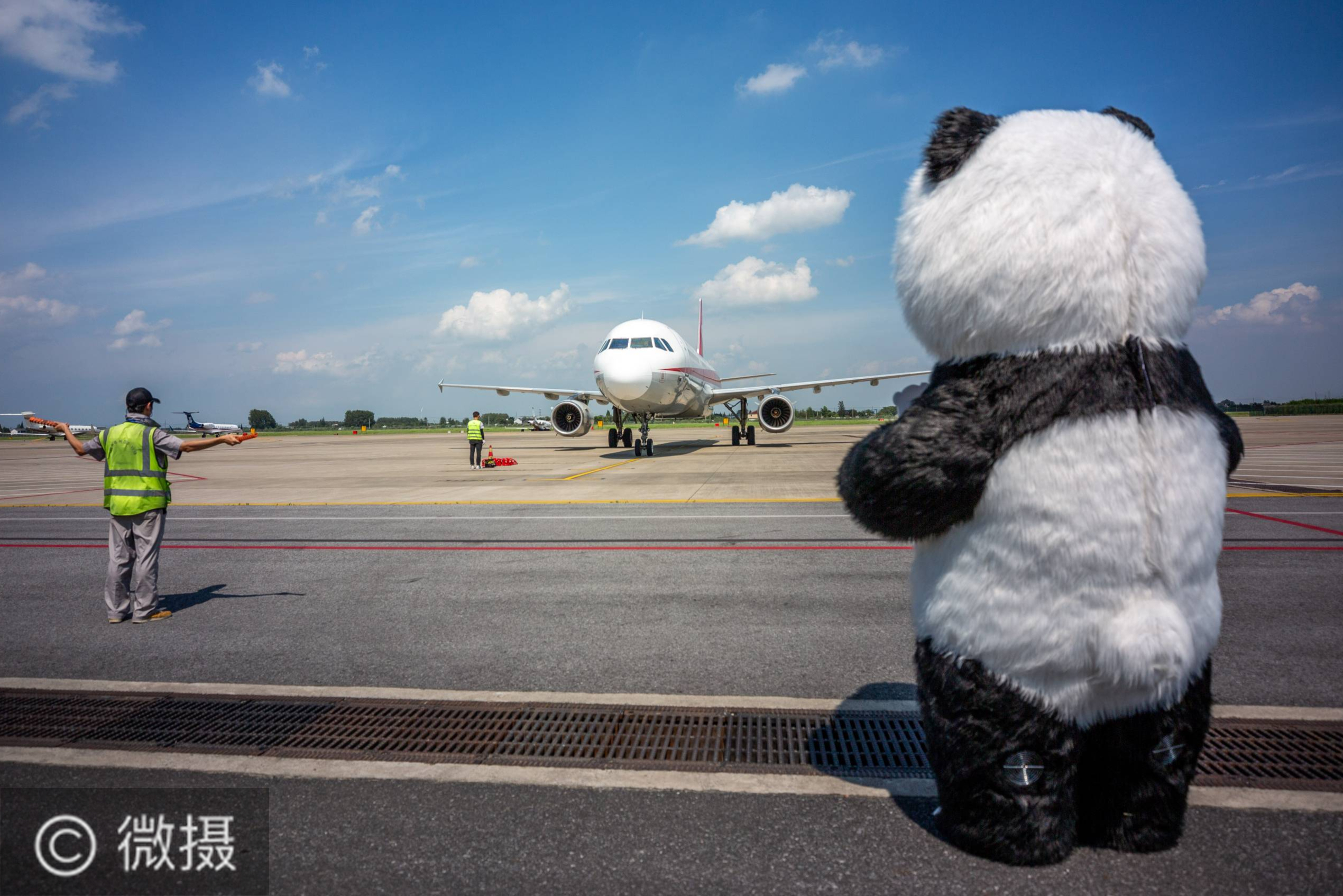 8月5日,大熊猫人偶在扬州泰州国际机场迎接大熊猫“云儿”和“震生”。当日下午,从成都双流机场起飞的3U8905航班平稳降落在江苏扬州泰州国际机场,飞机上载着来自中国大熊猫保护研究中心的大熊猫“云儿”和“震生”。之后它们将前往盐城大丰港动物园。新华社发(郁兴 摄)