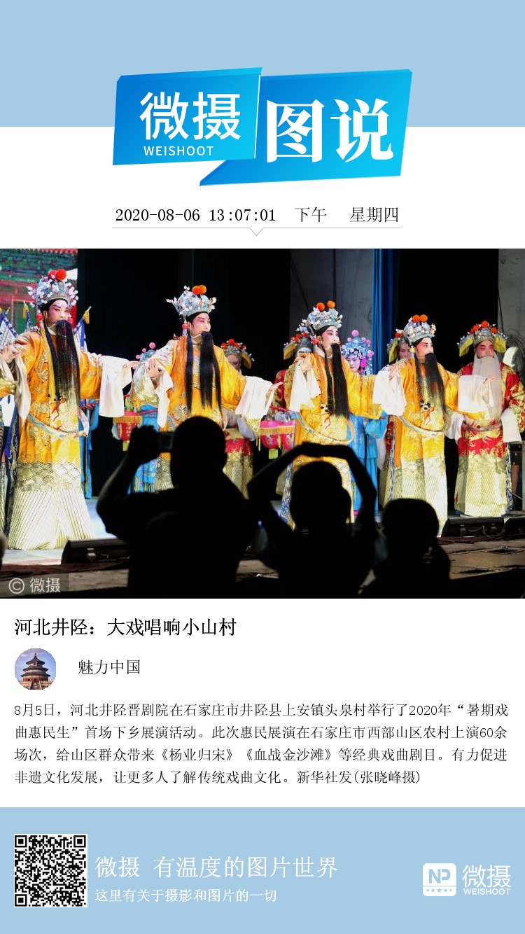 8月5日,河北井陉晋剧院在石家庄市井陉县上安镇头泉村举行了2020年“暑期戏曲惠民生”首场下乡展演活动。此次惠民展演在石家庄市西部山区农村上演60余场次,给山区群众带来《杨业归宋》《血战金沙滩》等经典戏曲剧目。有力促进非遗文化发展,让更多人了解传统戏曲文化。新华社发(张晓峰摄)