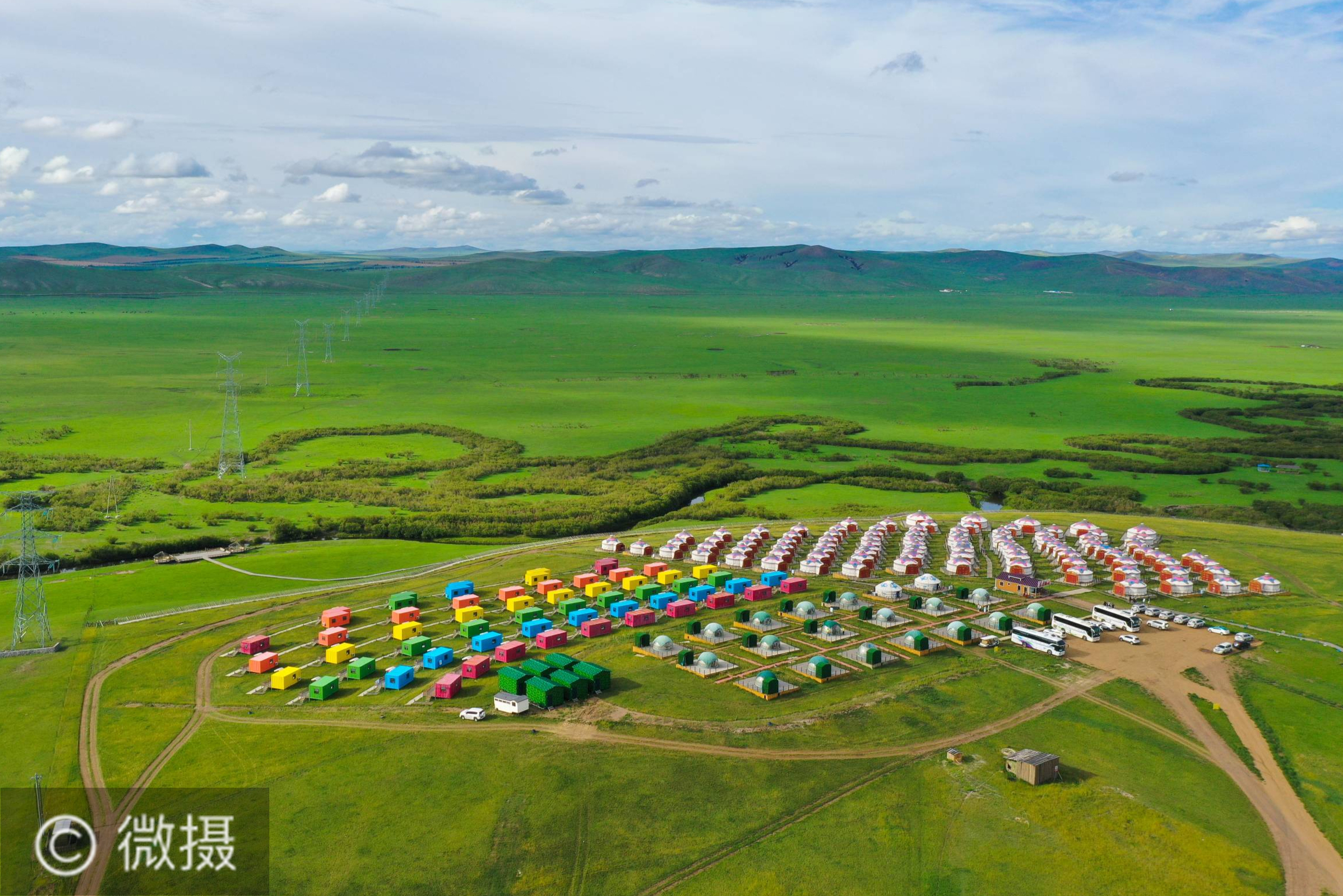 这是呼伦贝尔陈巴尔虎旗天下草原游牧部落一景(8月3日摄,无人机照片)。今年暑期,内蒙古呼伦贝尔通过暂行周末2.5天弹性休假工作制度,发放旅游、餐饮消费券,景区推出优惠促销活动等措施,提振当地旅游市场。新华社记者 徐钦 摄