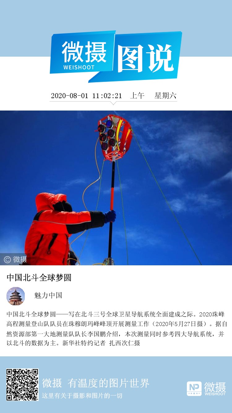 中国北斗全球梦圆——写在北斗三号全球卫星导航系统全面建成之际。2020珠峰高程测量登山队队员在珠穆朗玛峰峰顶开展测量工作(2020年5月27日摄)。据自然资源部第一大地测量队队长李国鹏介绍,本次测量同时参考四大导航系统,并以北斗的数据为主。新华社特约记者 扎西次仁摄