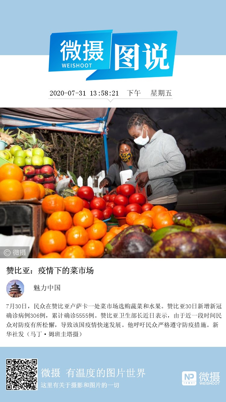 7月30日,民众在赞比亚卢萨卡一处菜市场选购蔬菜和水果。赞比亚30日新增新冠确诊病例306例,累计确诊5555例。赞比亚卫生部长近日表示,由于近一段时间民众对防疫有所松懈,导致该国疫情快速发展。他呼吁民众严格遵守防疫措施。新华社发(马丁·姆班圭塔摄)