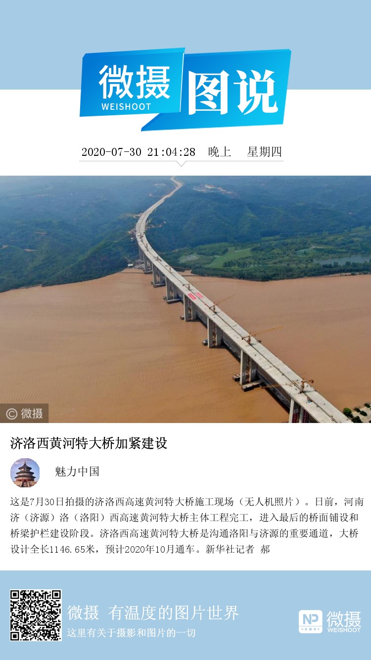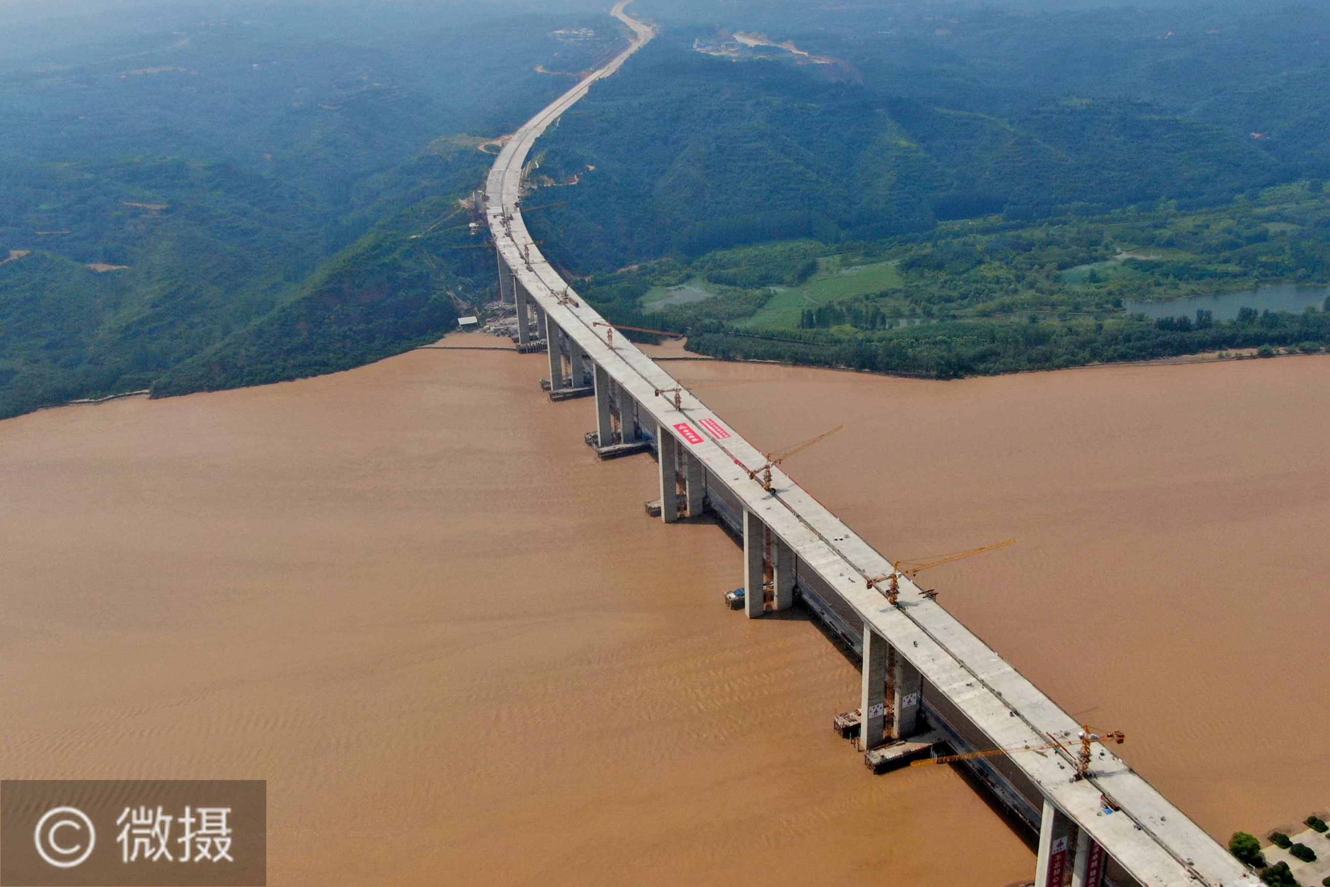 这是7月30日拍摄的济洛西高速黄河特大桥施工现场(无人机照片)。日前,河南济(济源)洛(洛阳)西高速黄河特大桥主体工程完工,进入最后的桥面铺设和桥梁护栏建设阶段。济洛西高速黄河特大桥是沟通洛阳与济源的重要通道,大桥设计全长1146.65米,预计2020年10月通车。新华社记者 郝
