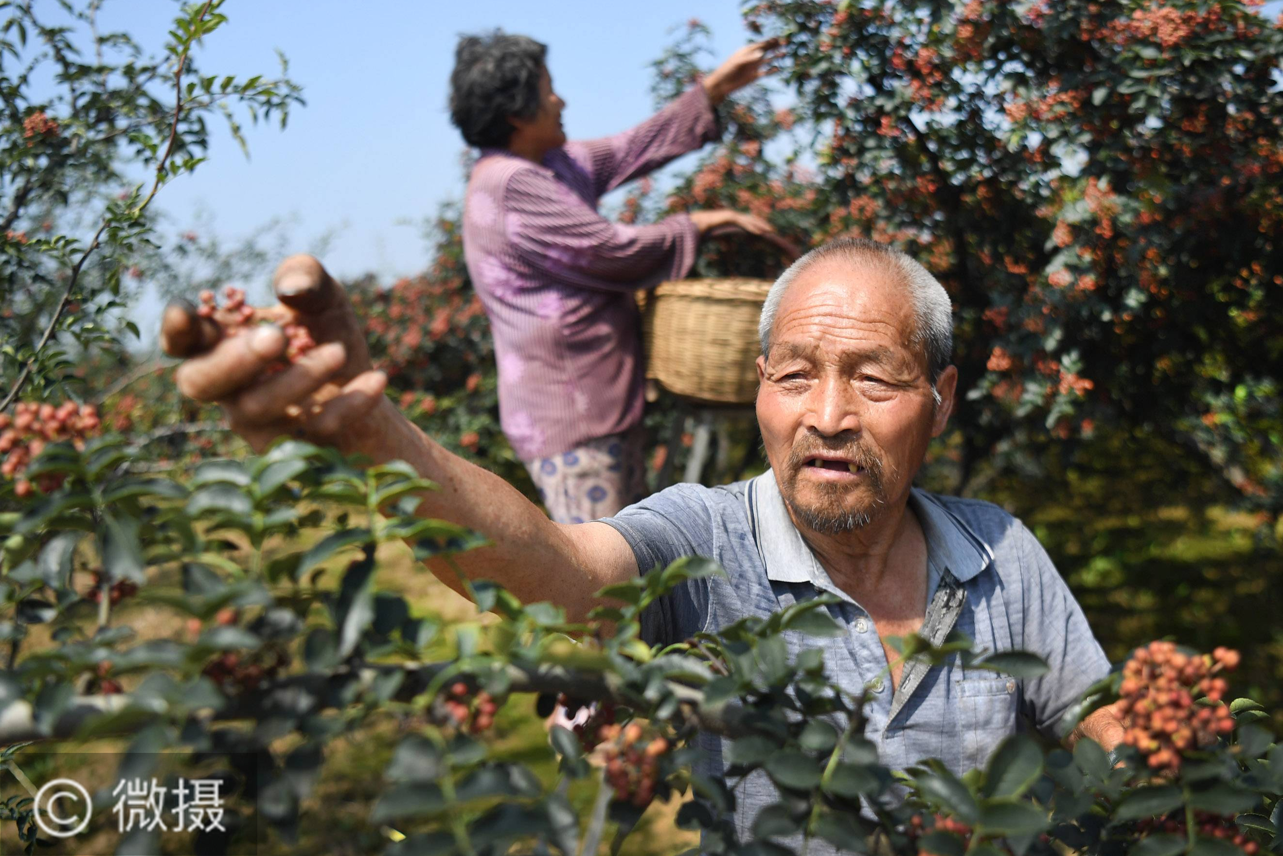 7月30日,渭南市华州区大明镇下李村徐社民(前)在自家花椒地里采摘花椒。他家10亩花椒地今年可收入4万多元。近年来,陕西省渭南市华州区围绕乡村振兴和精准脱贫总目标,扩大“华州花椒”种植规模,花椒产业已成为当地村民致富奔小康的“摇钱树”。新华社记者 陶明 摄