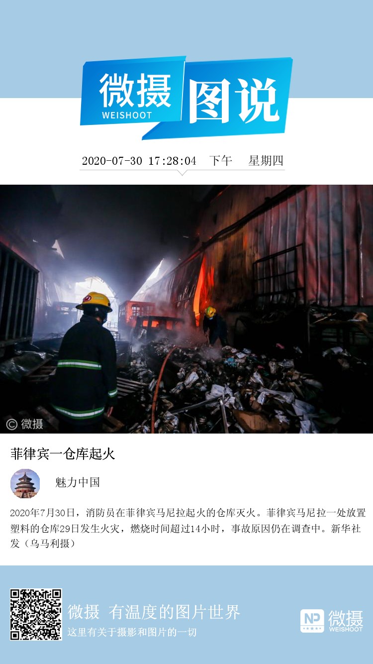2020年7月30日,消防员在菲律宾马尼拉起火的仓库灭火。菲律宾马尼拉一处放置塑料的仓库29日发生火灾,燃烧时间超过14小时,事故原因仍在调查中。新华社发(乌马利摄)