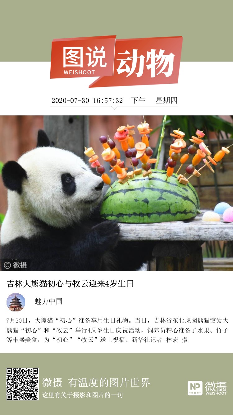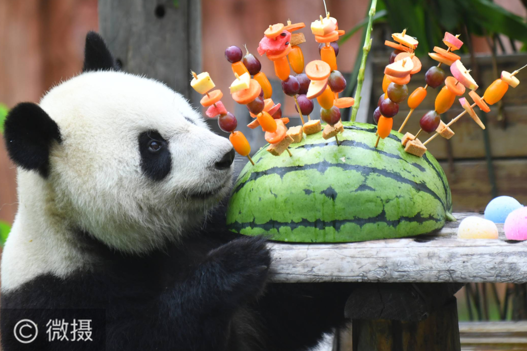 7月30日,大熊猫“初心”准备享用生日礼物。当日,吉林省东北虎园熊猫馆为大熊猫“初心”和“牧云”举行4周岁生日庆祝活动,饲养员精心准备了水果、竹子等丰盛美食,为“初心”“牧云”送上祝福。新华社记者 林宏 摄