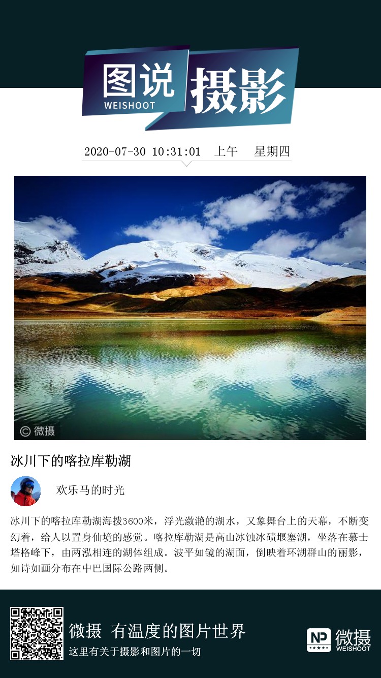 冰川下的喀拉库勒湖海拨3600米,浮光潋滟的湖水,又象舞台上的天幕,不断变幻着,给人以置身仙境的感觉。喀拉库勒湖是高山冰蚀冰碛堰塞湖,坐落在慕士塔格峰下,由两泓相连的湖体组成。波平如镜的湖面,倒映着环湖群山的丽影,如诗如画分布在中巴国际公路两侧。