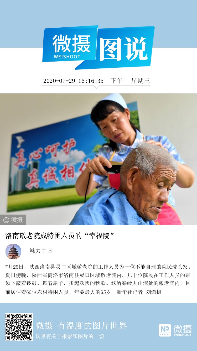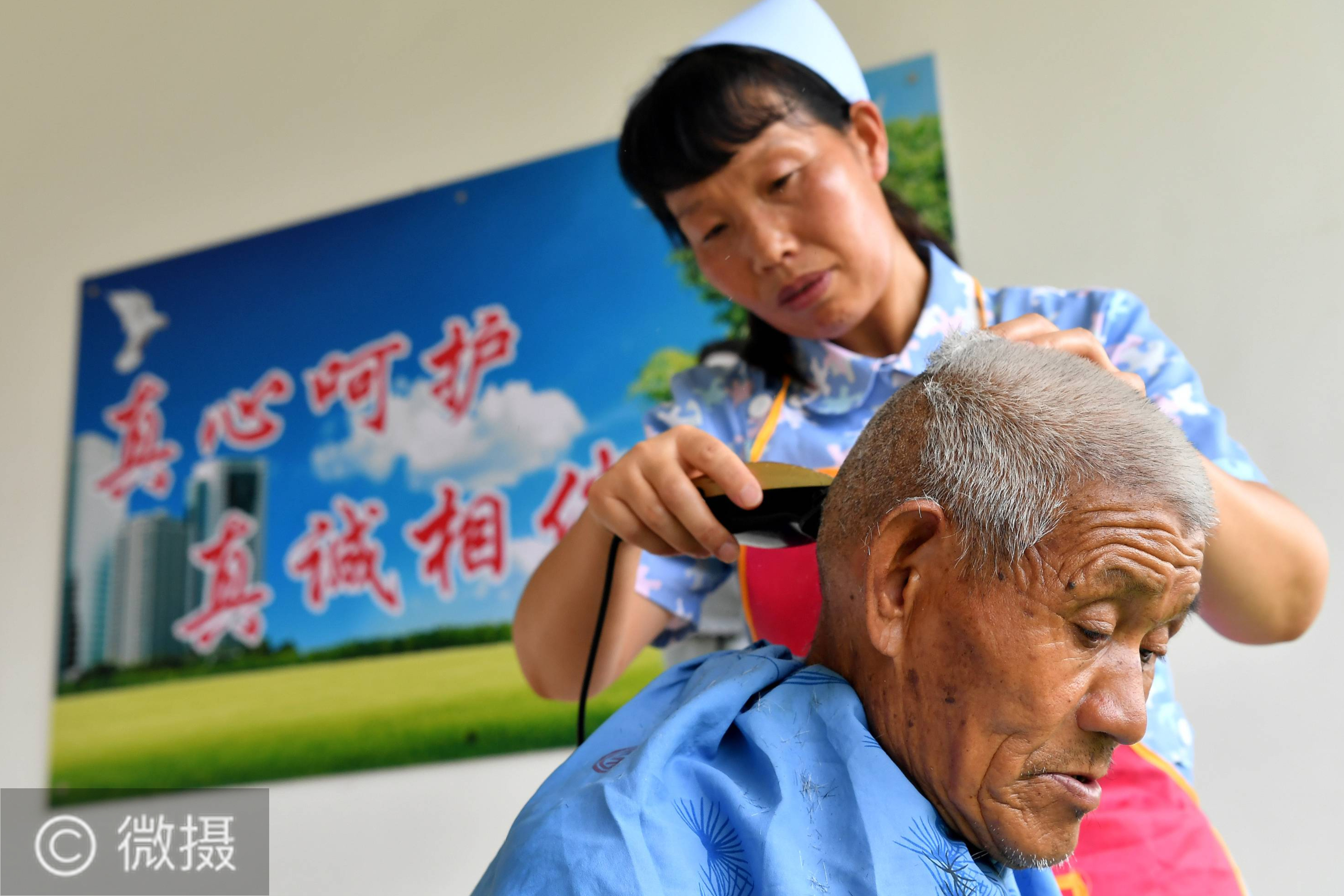 7月28日,陕西洛南县灵口区域敬老院的工作人员为一位不能自理的院民洗头发。夏日傍晚,陕西省商洛市洛南县灵口区域敬老院内,几十位院民在工作人员的带领下敲着锣鼓、舞着扇子,扭起欢快的秧歌。这所秦岭大山深处的敬老院内,目前居住着60位农村特困人员,年龄最大的85岁。新华社记者 刘潇摄