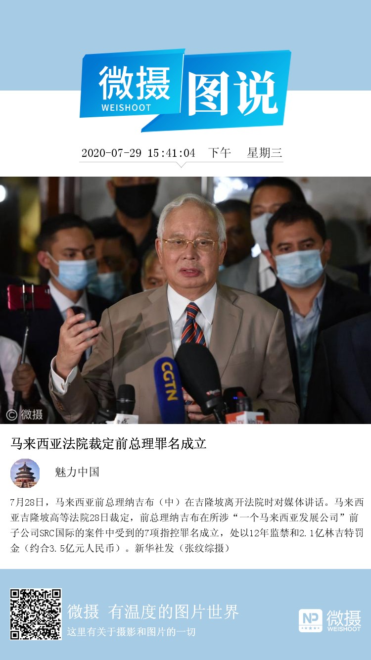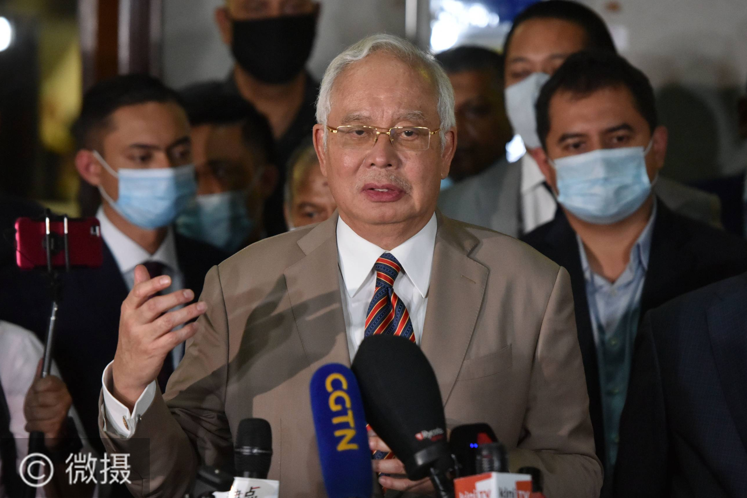7月28日,马来西亚前总理纳吉布(中)在吉隆坡离开法院时对媒体讲话。马来西亚吉隆坡高等法院28日裁定,前总理纳吉布在所涉“一个马来西亚发展公司”前子公司SRC国际的案件中受到的7项指控罪名成立,处以12年监禁和2.1亿林吉特罚金(约合3.5亿元人民币)。新华社发(张纹综摄)