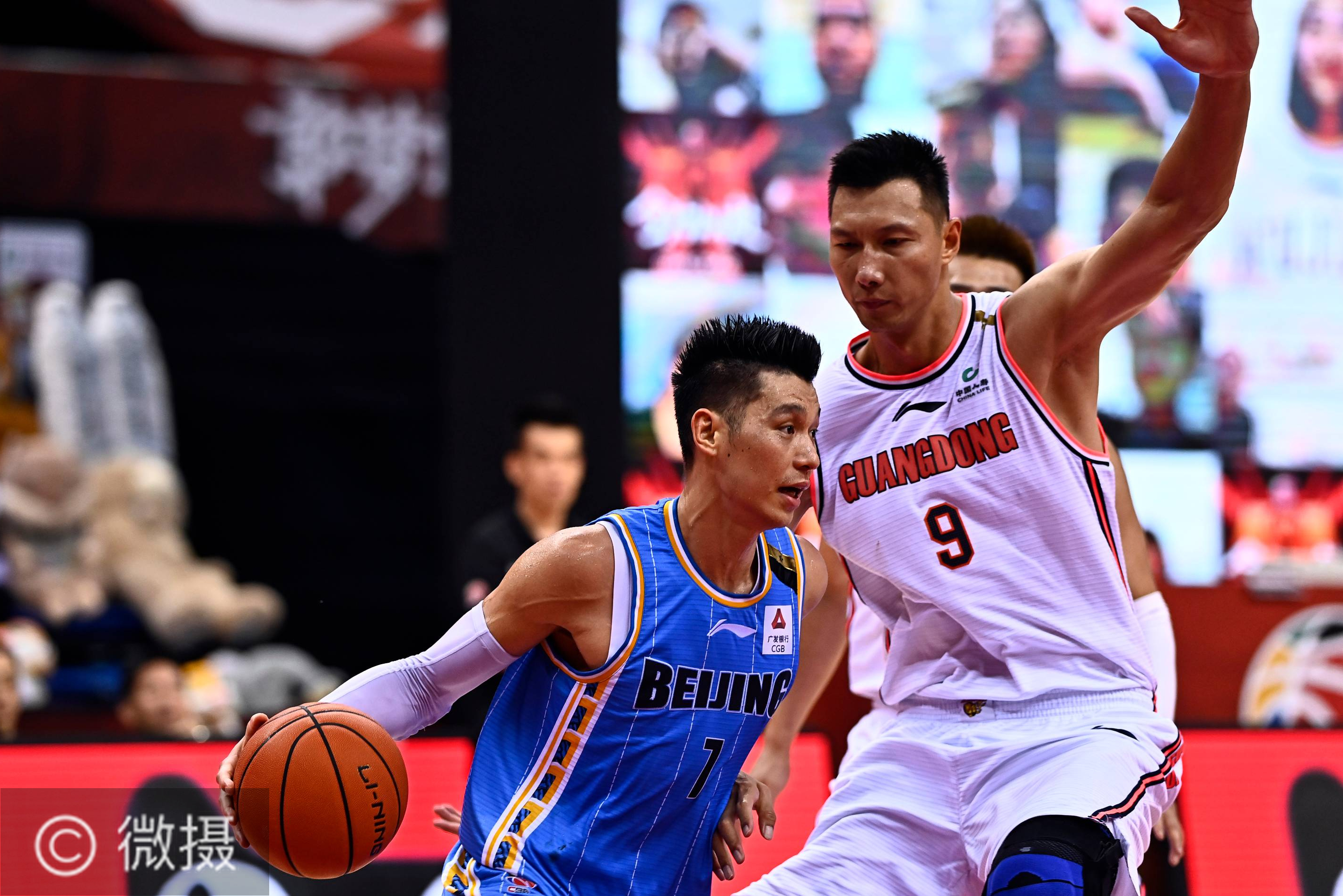7月26日,广东东莞银行队球员易建联(右)在比赛中防守北京首钢队球员林书豪。当日,在山东青岛举行的2019-2020赛季中国男子篮球职业联赛(CBA)复赛第二阶段(崂山赛区)比赛中,北京首钢队以82比101不敌广东东莞银行队。新华社记者郭绪雷摄