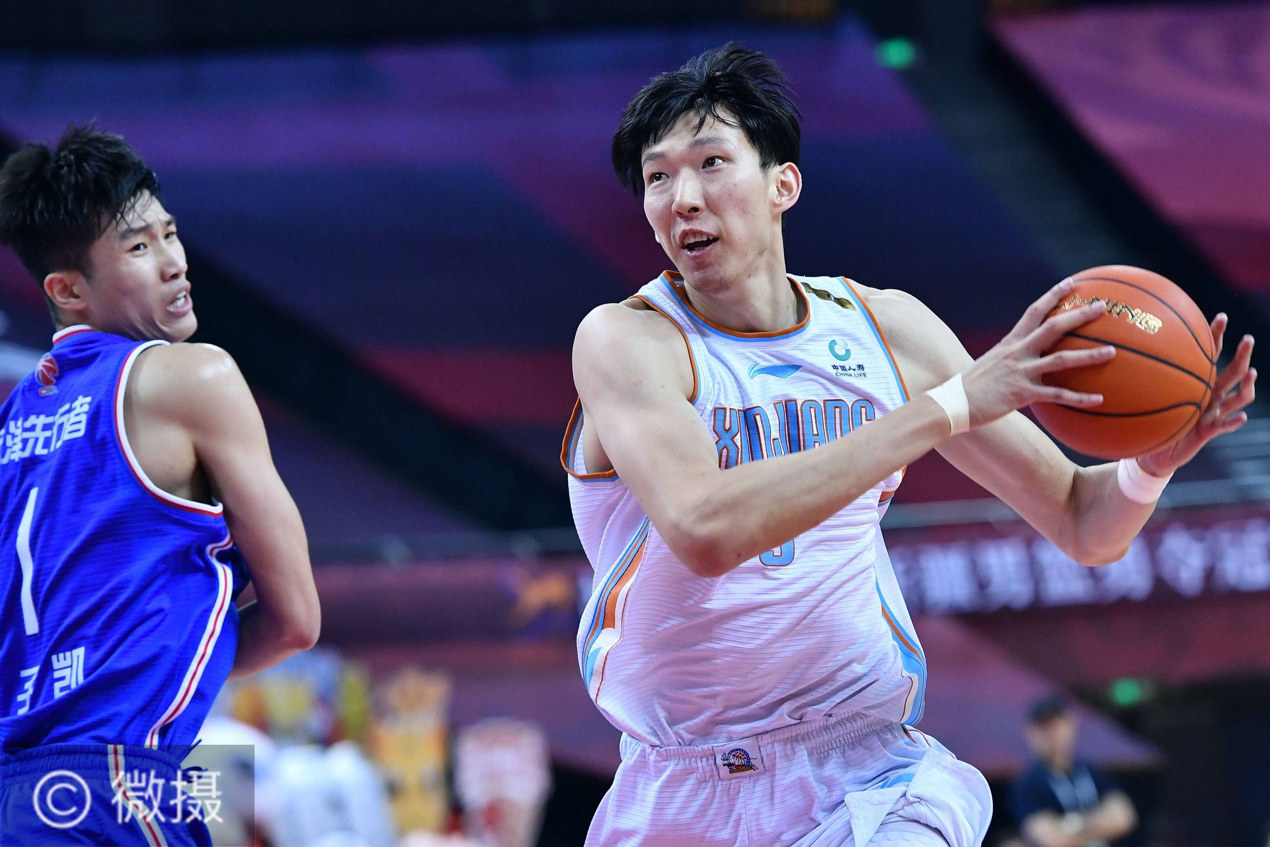 7月25日,新疆伊力特队球员周琦(右)在比赛中带球突破。当日,在山东青岛举行的2019-2020赛季中国男子篮球职业联赛(CBA)复赛第二阶段(红岛赛区)比赛中,新疆伊力特队以105比93战胜天津先行者队。新华社记者朱峥摄