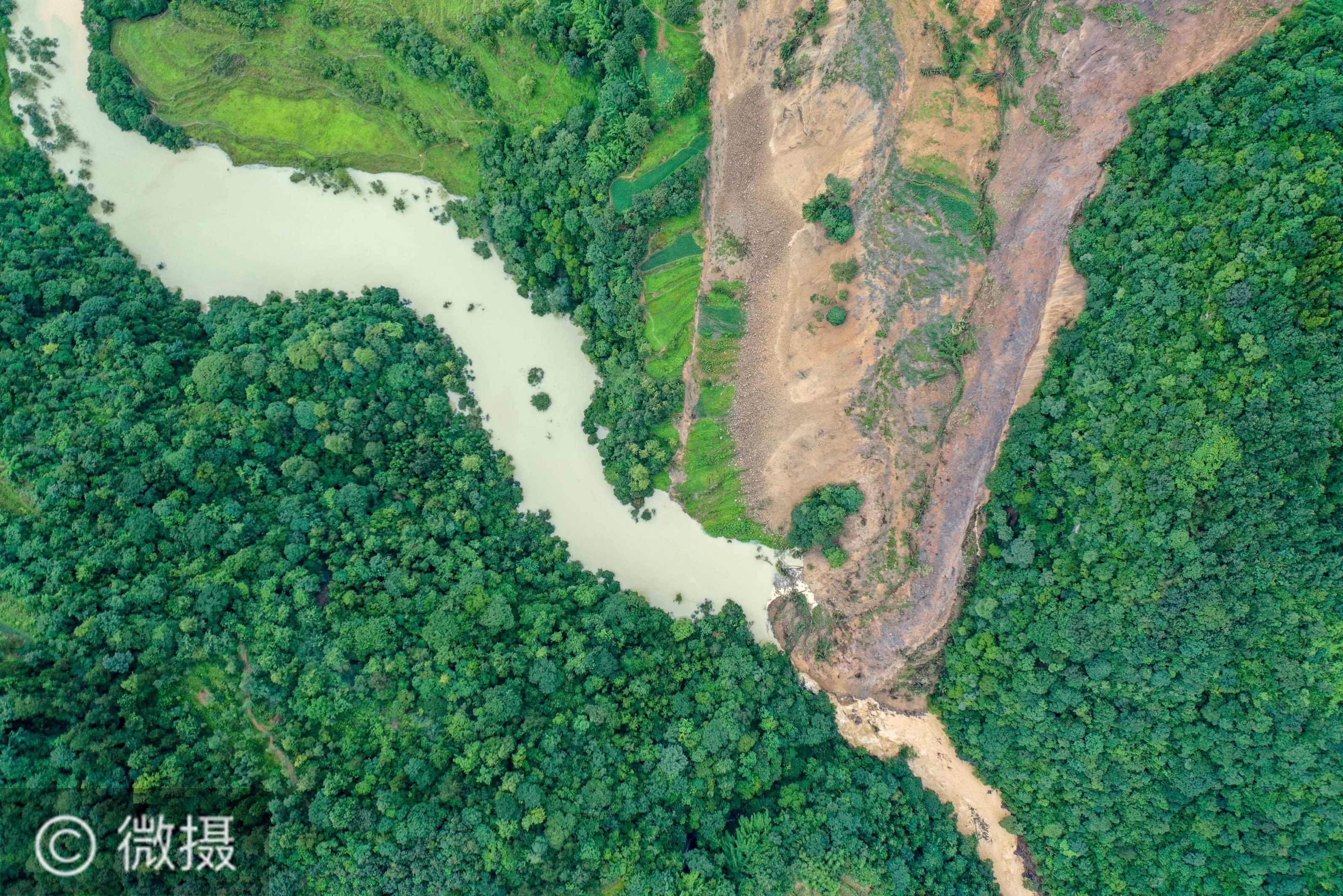 这是7月26日拍摄的重庆市武隆区土地乡六井村中台组中堡滑坡现场(无人机照片)。记者26日从重庆市武隆区政府了解到,暴雨导致当地发生山体滑坡并形成堰塞湖,500余名群众紧急转移。新华社记者 黄伟 摄
