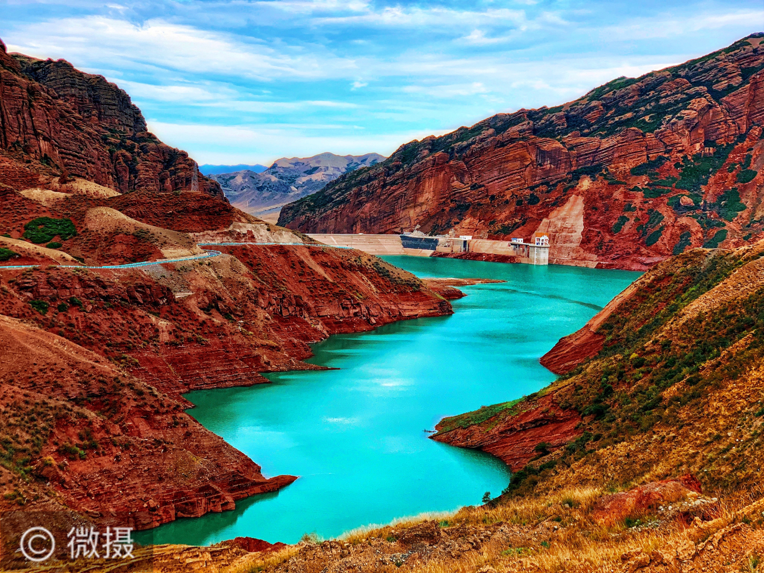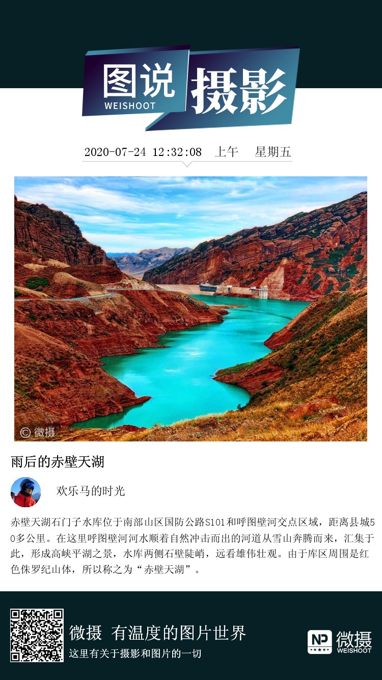赤壁天湖石门子水库位于南部山区国防公路S101和呼图壁河交点区域,距离县城50多公里。在这里呼图壁河河水顺着自然冲击而出的河道从雪山奔腾而来,汇集于此,形成高峡平湖之景,水库两侧石壁陡峭,远看雄伟壮观。由于库区周围是红色侏罗纪山体,所以称之为“赤壁天湖”。