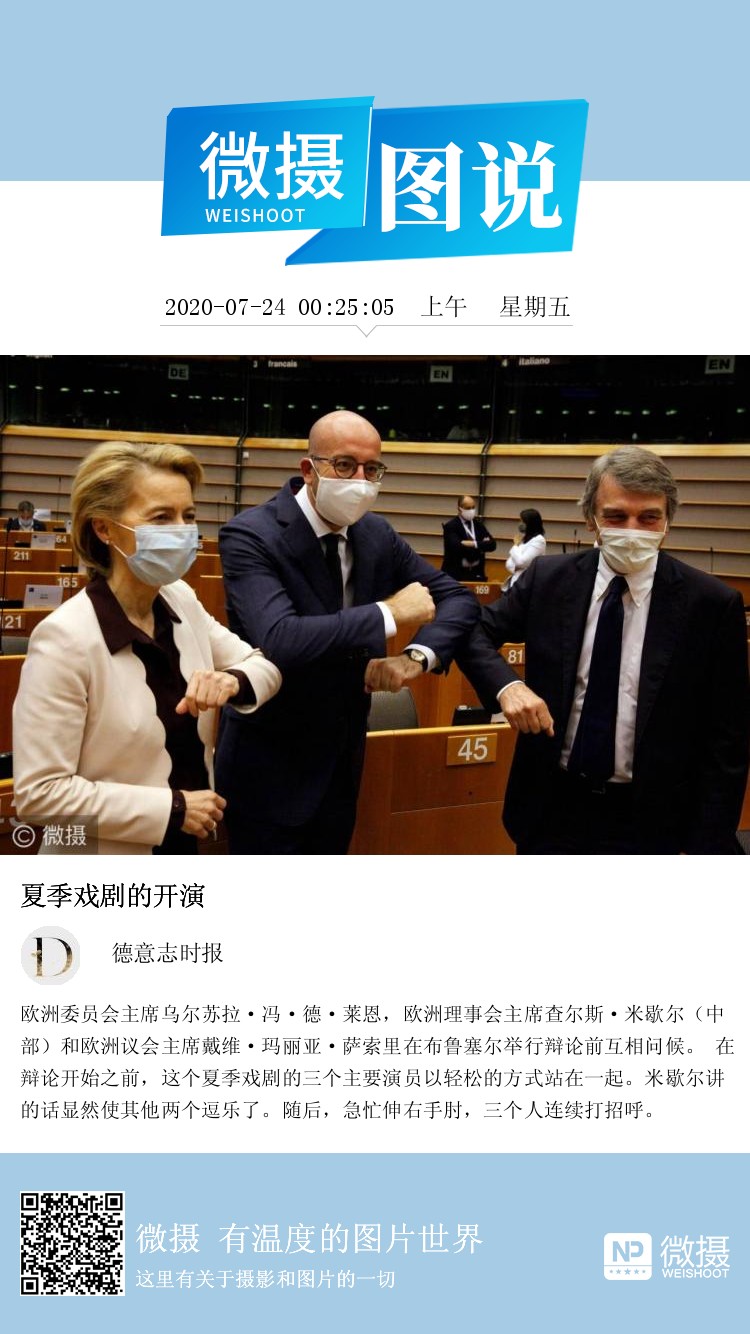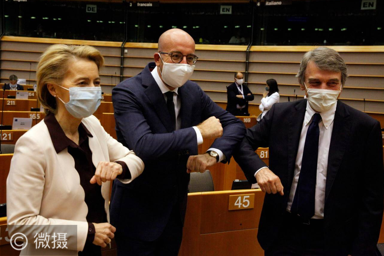 欧洲委员会主席乌尔苏拉·冯·德·莱恩,欧洲理事会主席查尔斯·米歇尔(中部)和欧洲议会主席戴维·玛丽亚·萨索里在布鲁塞尔举行辩论前互相问候。 在辩论开始之前,这个夏季戏剧的三个主要演员以轻松的方式站在一起。米歇尔讲的话显然使其他两个逗乐了。随后,急忙伸右手肘,三个人连续打招呼。