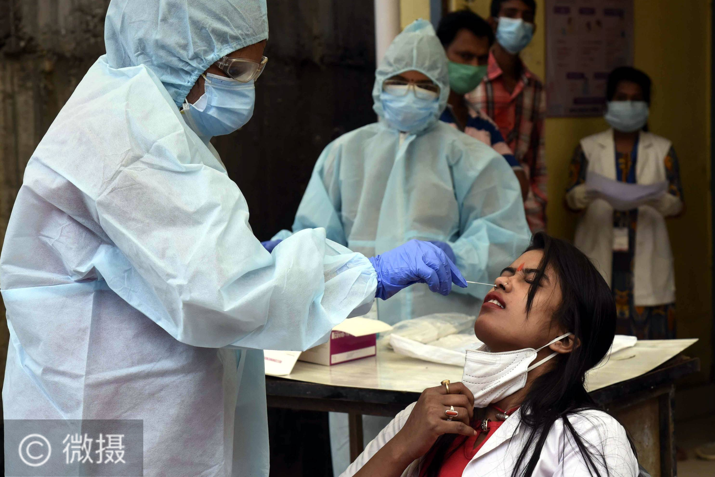 7月21日,医务人员在印度比哈尔邦一处新冠病毒检测点为一名女子采集检测样本。印度卫生部门7月22日发布的数据显示,印度累计新冠确诊病例达1192915例。新华社发