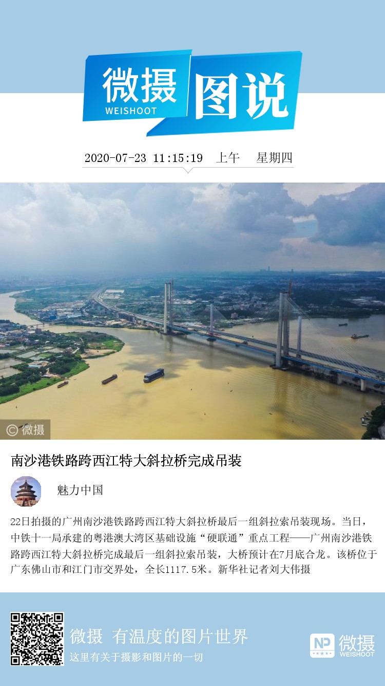 22日拍摄的广州南沙港铁路跨西江特大斜拉桥最后一组斜拉索吊装现场。当日,中铁十一局承建的粤港澳大湾区基础设施“硬联通”重点工程——广州南沙港铁路跨西江特大斜拉桥完成最后一组斜拉索吊装,大桥预计在7月底合龙。该桥位于广东佛山市和江门市交界处,全长1117.5米。新华社记者刘大伟摄