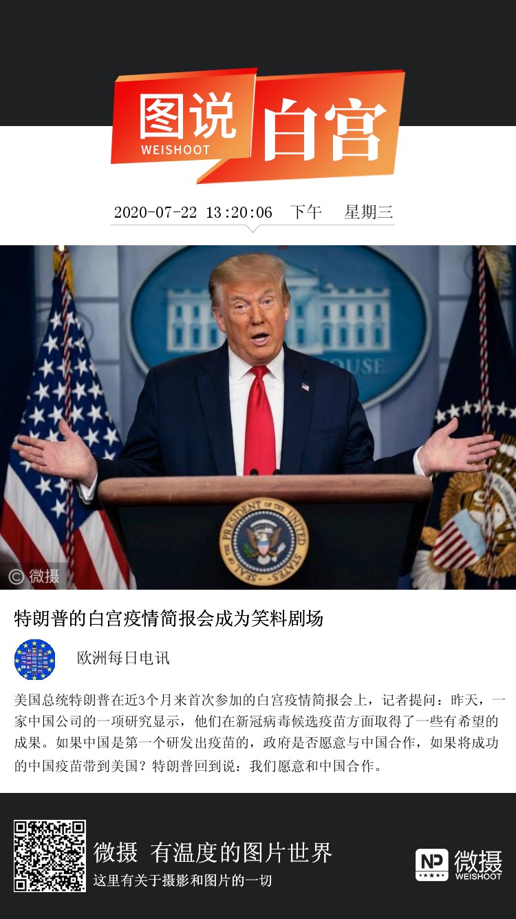 美国总统特朗普在近3个月来首次参加的白宫疫情简报会上,记者提问:昨天,一家中国公司的一项研究显示,他们在新冠病毒候选疫苗方面取得了一些有希望的成果。如果中国是第一个研发出疫苗的,政府是否愿意与中国合作,如果将成功的中国疫苗带到美国?特朗普回到说:我们愿意和中国合作。