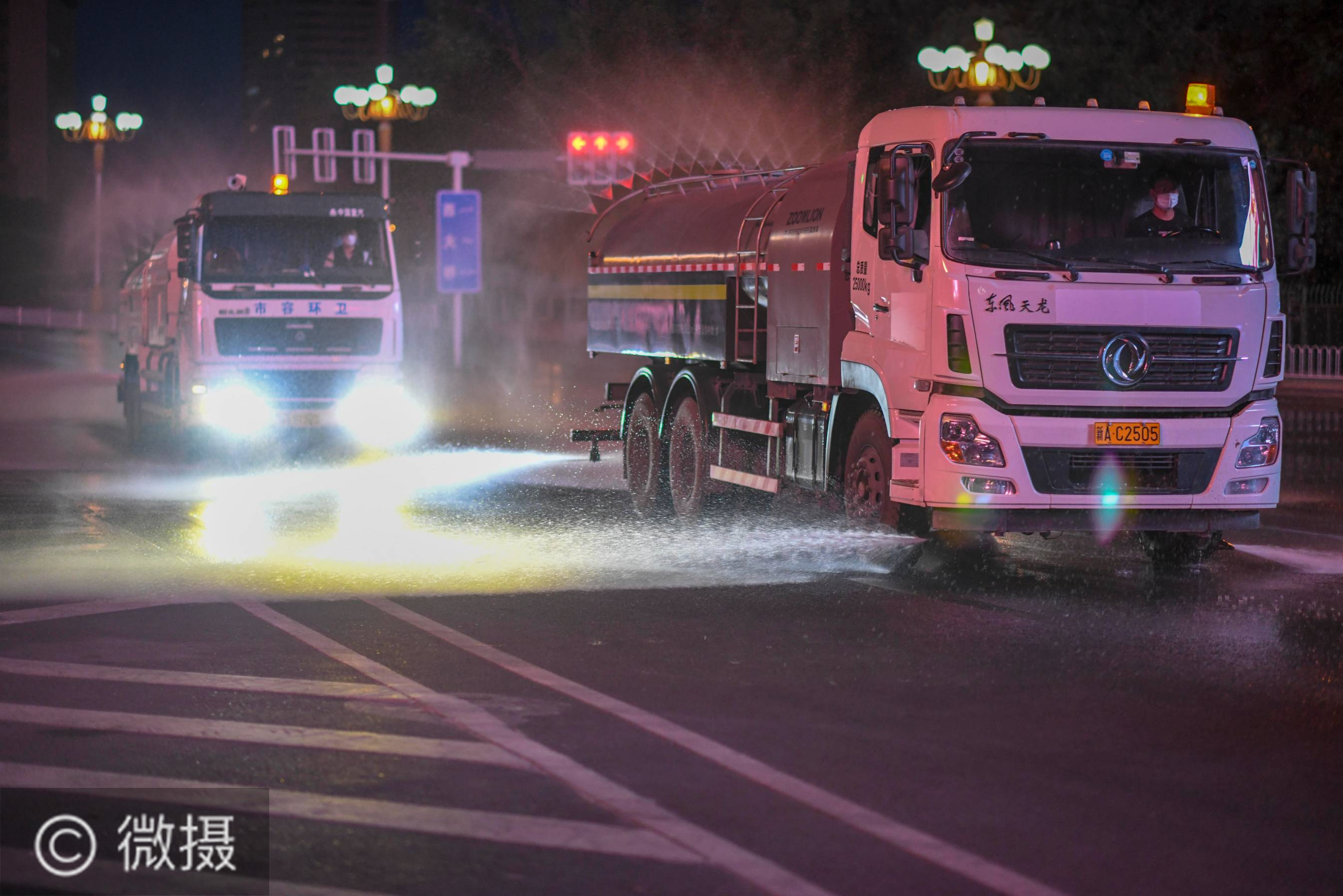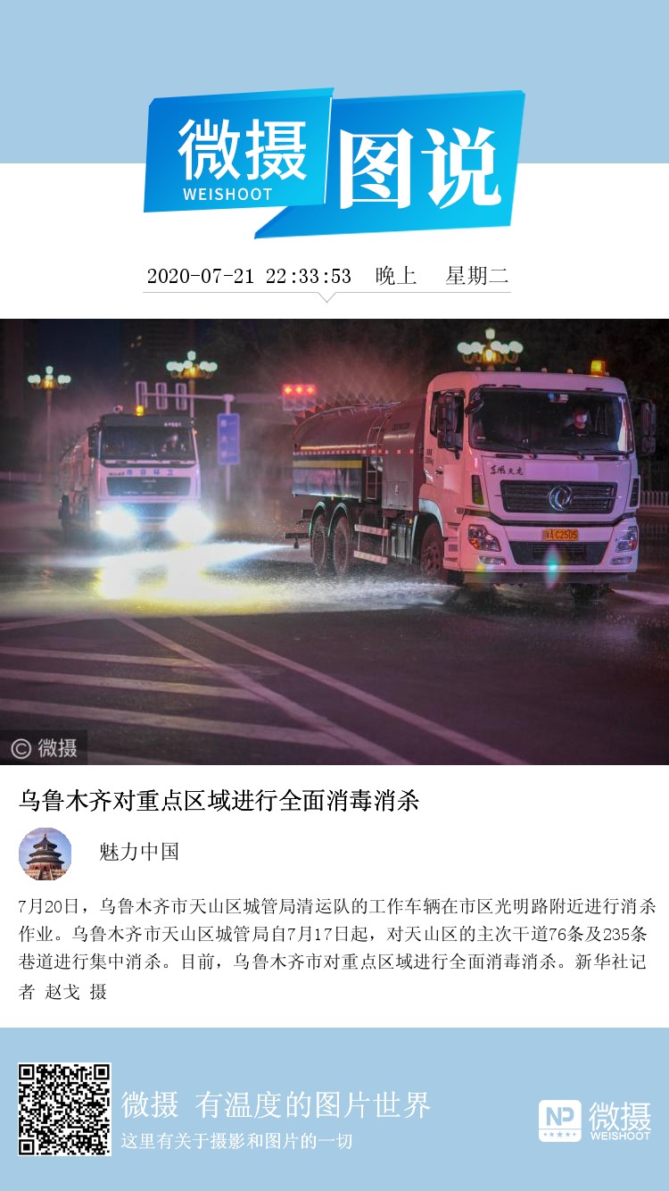 7月20日,乌鲁木齐市天山区城管局清运队的工作车辆在市区光明路附近进行消杀作业。乌鲁木齐市天山区城管局自7月17日起,对天山区的主次干道76条及235条巷道进行集中消杀。目前,乌鲁木齐市对重点区域进行全面消毒消杀。新华社记者 赵戈 摄