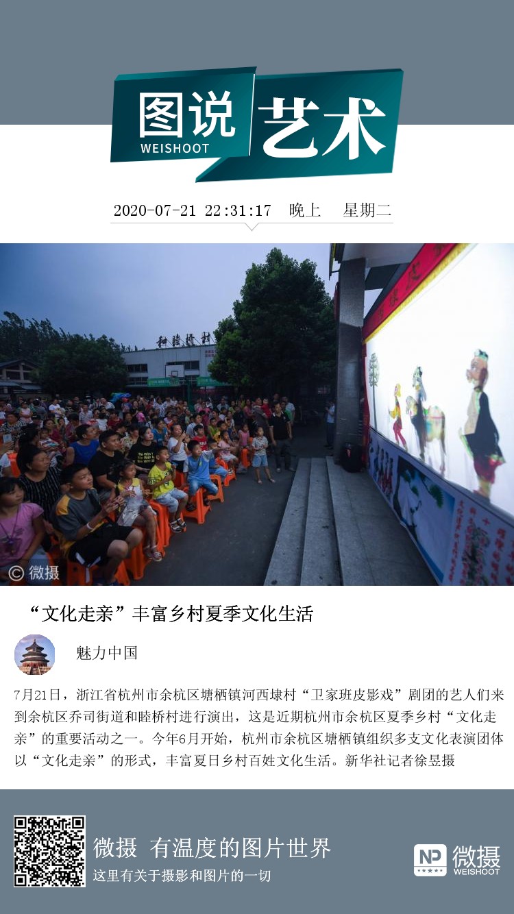 7月21日,浙江省杭州市余杭区塘栖镇河西埭村“卫家班皮影戏”剧团的艺人们来到余杭区乔司街道和睦桥村进行演出,这是近期杭州市余杭区夏季乡村“文化走亲”的重要活动之一。今年6月开始,杭州市余杭区塘栖镇组织多支文化表演团体以“文化走亲”的形式,丰富夏日乡村百姓文化生活。新华社记者徐昱摄