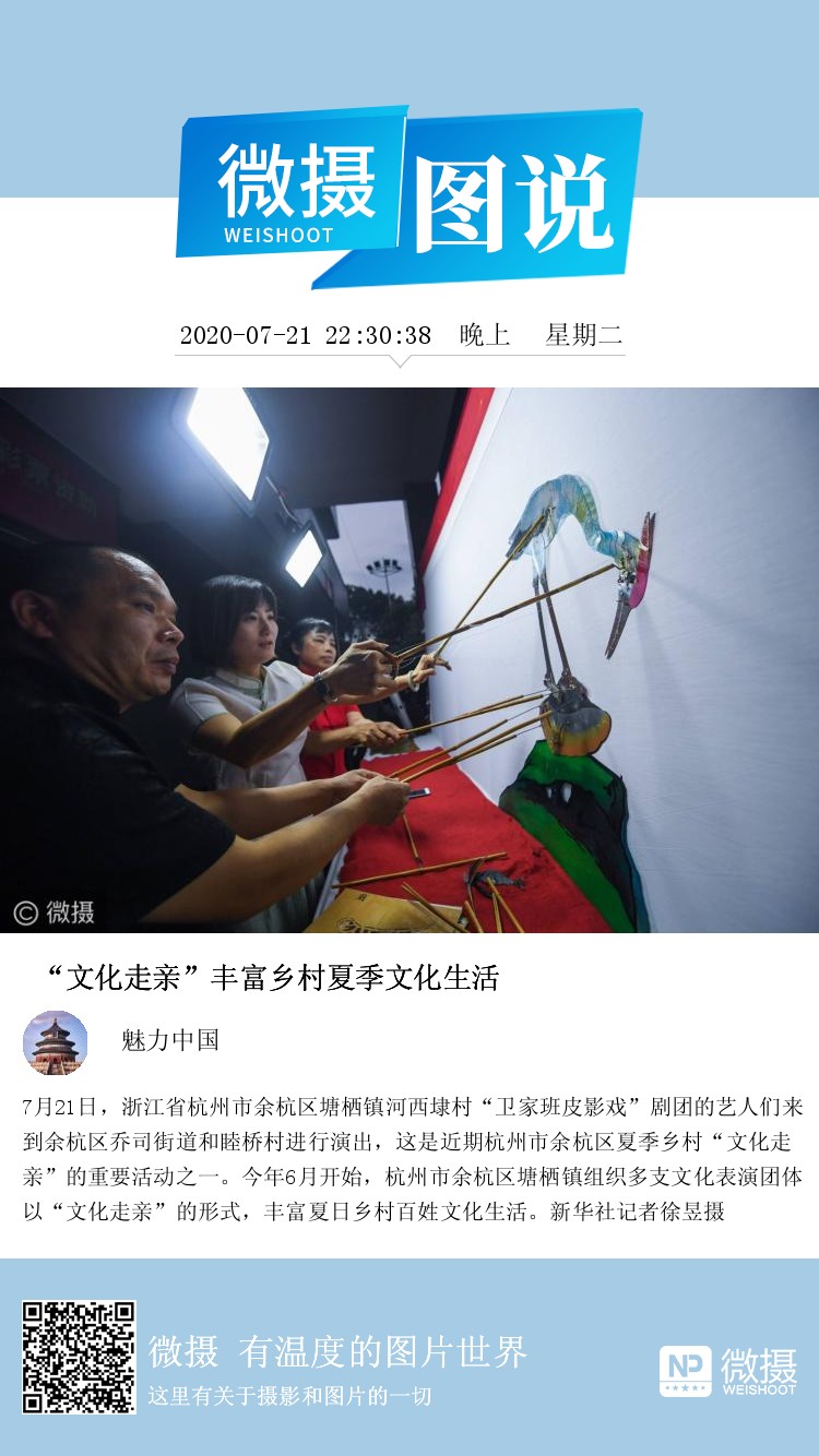 7月21日,浙江省杭州市余杭区塘栖镇河西埭村“卫家班皮影戏”剧团的艺人们来到余杭区乔司街道和睦桥村进行演出,这是近期杭州市余杭区夏季乡村“文化走亲”的重要活动之一。今年6月开始,杭州市余杭区塘栖镇组织多支文化表演团体以“文化走亲”的形式,丰富夏日乡村百姓文化生活。新华社记者徐昱摄