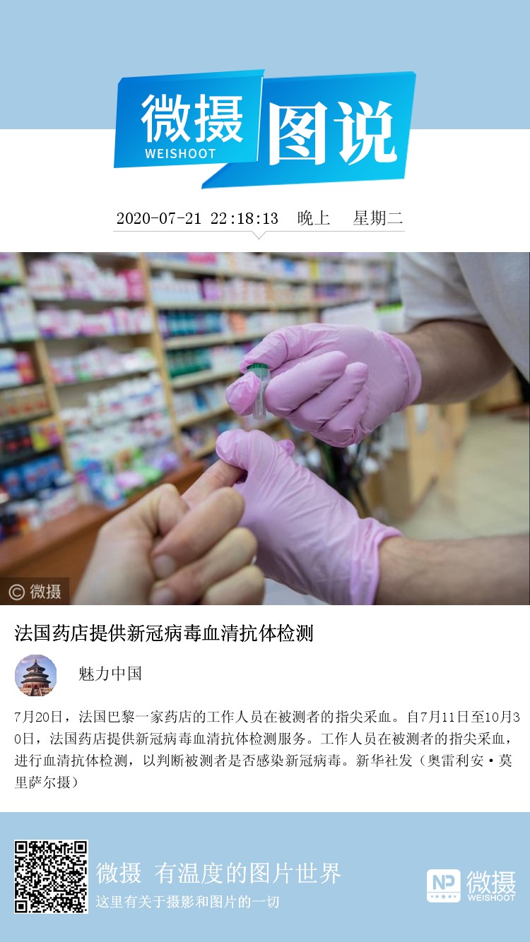 7月20日,法国巴黎一家药店的工作人员在被测者的指尖采血。自7月11日至10月30日,法国药店提供新冠病毒血清抗体检测服务。工作人员在被测者的指尖采血,进行血清抗体检测,以判断被测者是否感染新冠病毒。新华社发(奥雷利安·莫里萨尔摄)