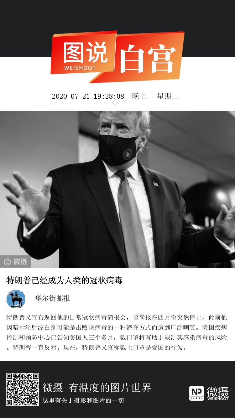 特朗普又宣布返回他的日常冠状病毒简报会,该简报在四月份突然停止,此前他因暗示注射漂白剂可能是击败该病毒的一种潜在方式而遭到广泛嘲笑。美国疾病控制和预防中心已告知美国人三个多月,戴口罩将有助于限制其感染病毒的风险。特朗普一直反对。现在,特朗普又宣称戴上口罩是爱国的行为。