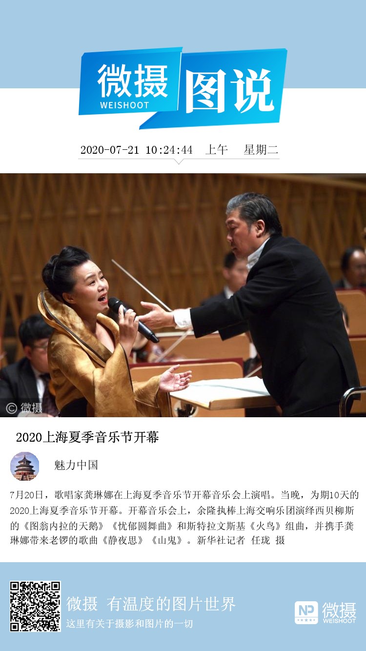 7月20日,歌唱家龚琳娜在上海夏季音乐节开幕音乐会上演唱。当晚,为期10天的2020上海夏季音乐节开幕。开幕音乐会上,余隆执棒上海交响乐团演绎西贝柳斯的《图翁内拉的天鹅》《忧郁圆舞曲》和斯特拉文斯基《火鸟》组曲,并携手龚琳娜带来老锣的歌曲《静夜思》《山鬼》。新华社记者 任珑 摄